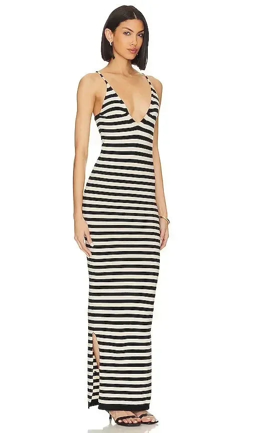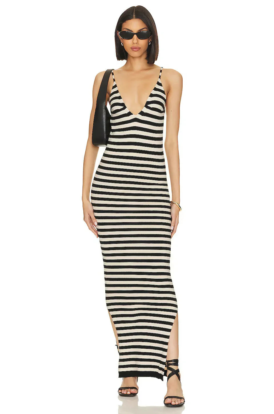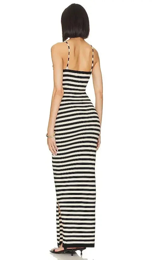 Effortless and elegant, the Phoebe Maxi Dress by SNDYS is crafted from soft ribbed knit fabric for a sleek, body-hugging silhouette. Designed in a striking black-and-white palette, it features side seam slits that add movement and a modern edge. The pull-on style and unlined construction make it an easy, comfortable choice for day-to-night wear.