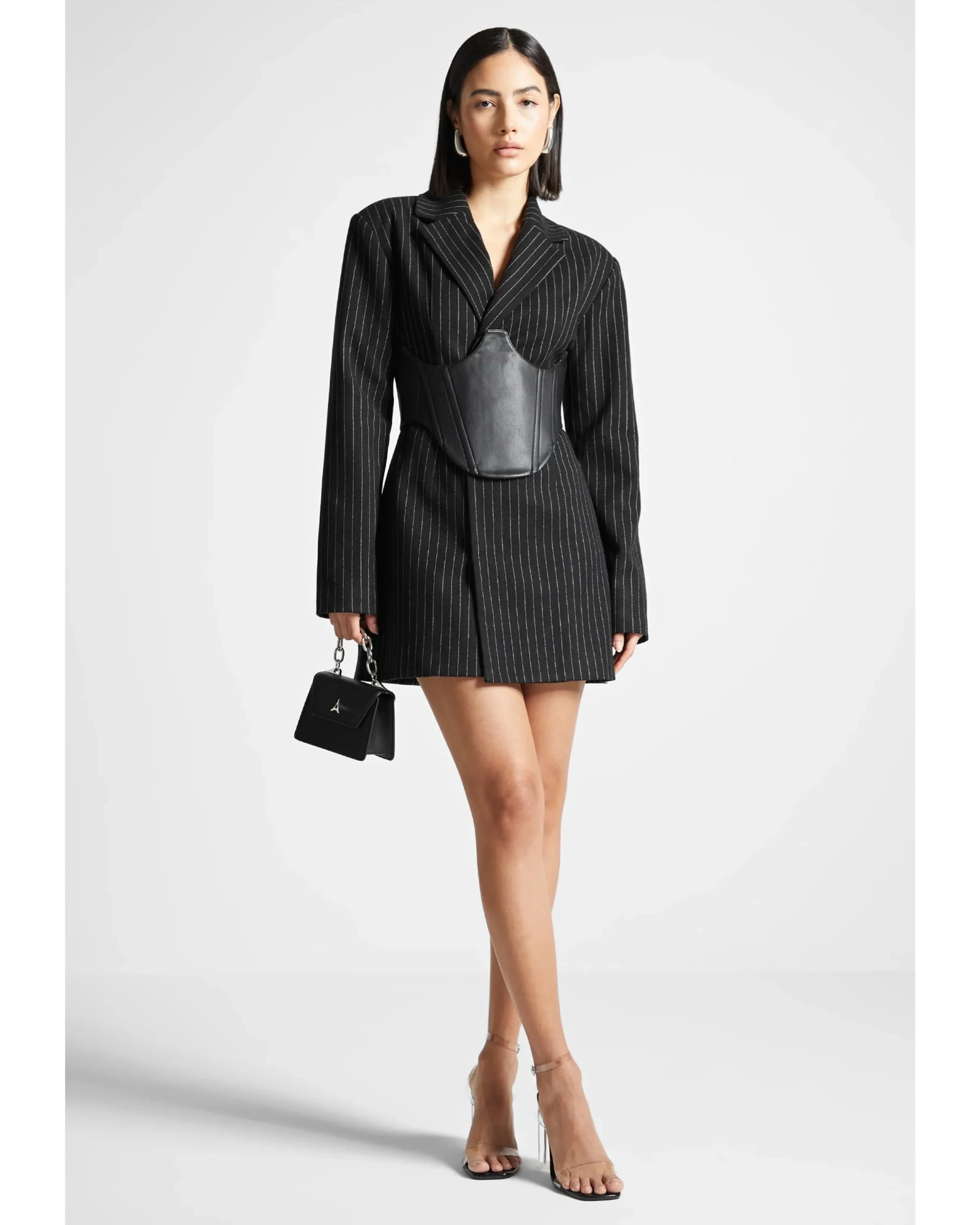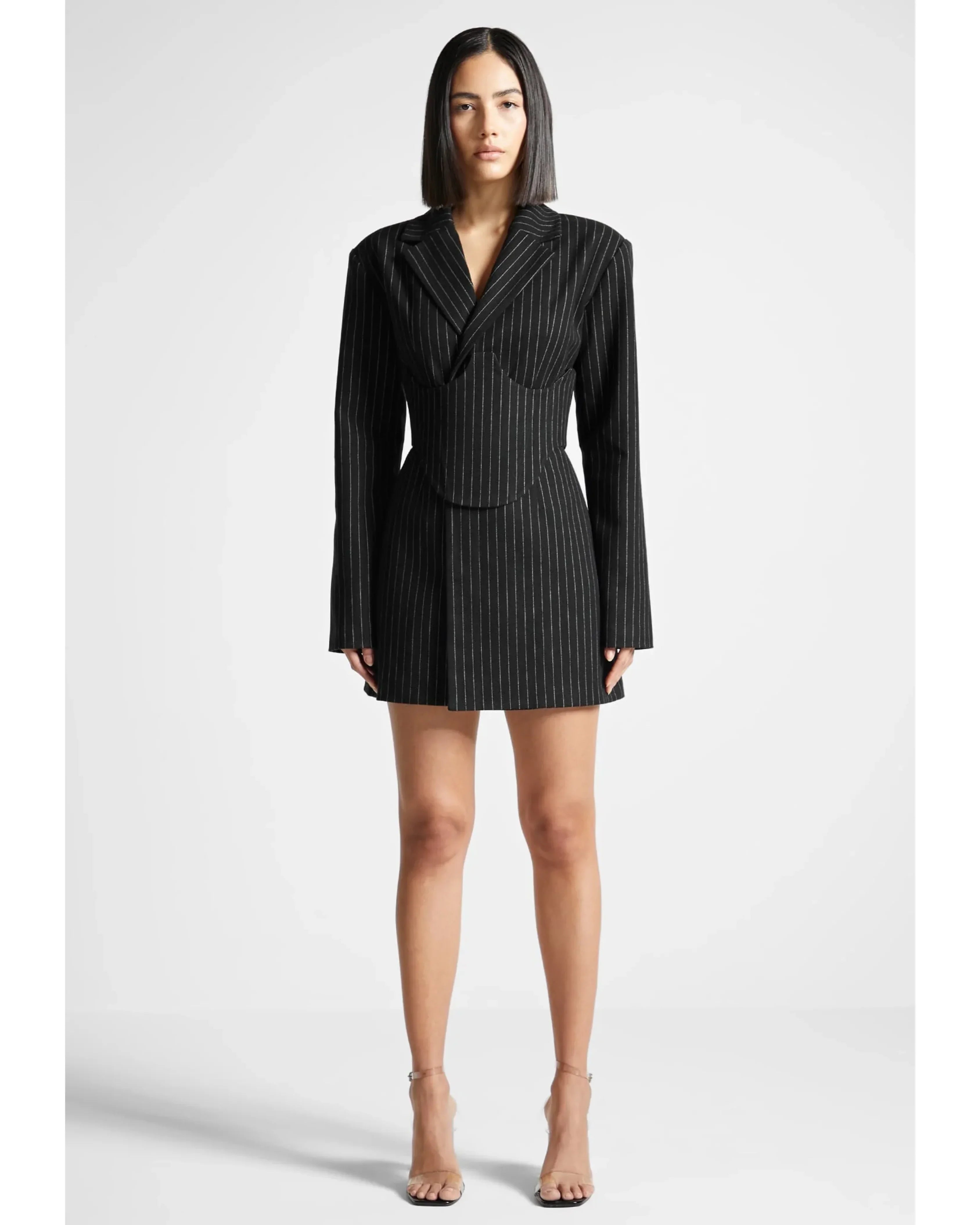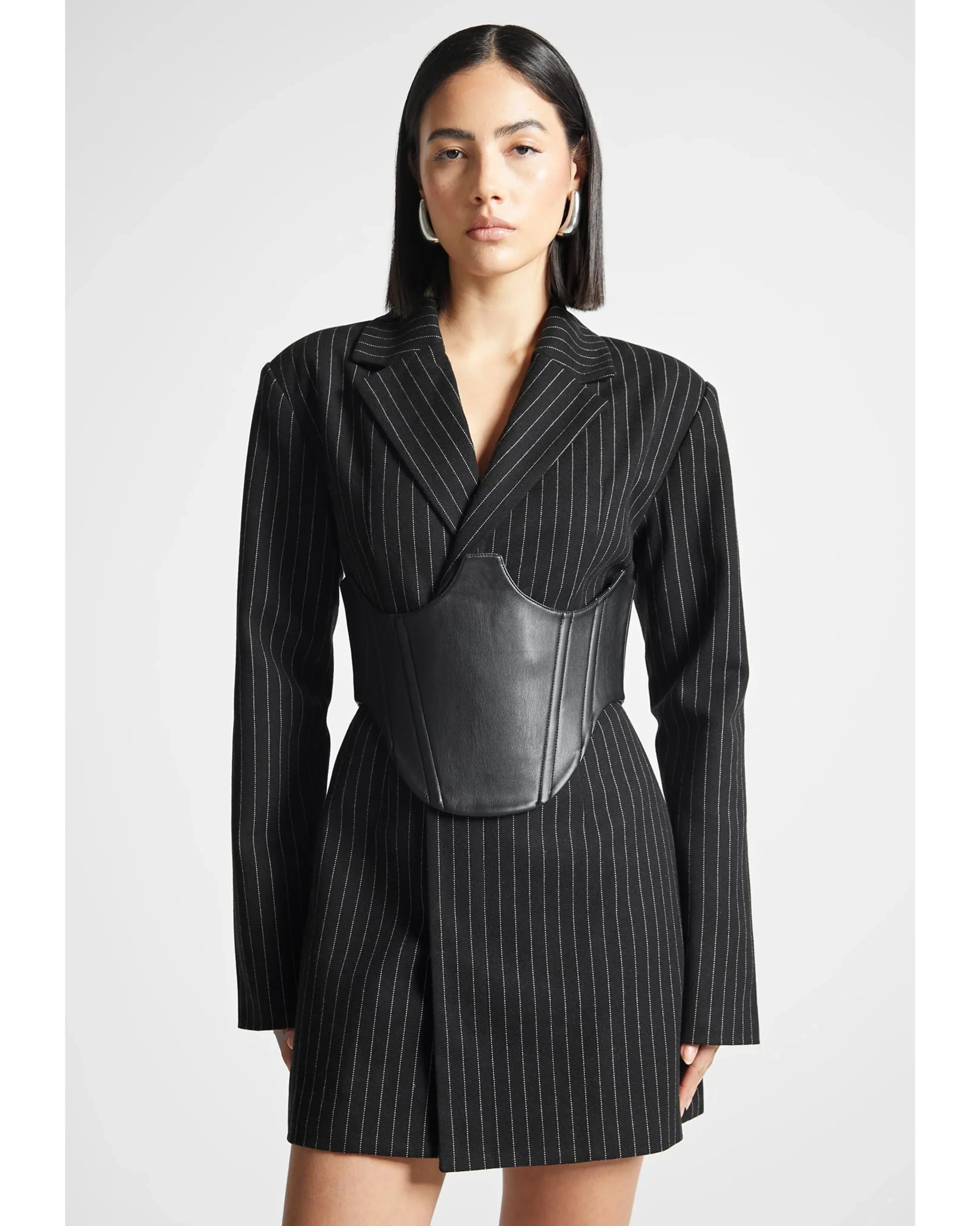 Make an impact no matter the occasion with this Pinstripe Blazer Dress with Reversible Corset. Remain classy and sophisticated all day long with its flattering shape. Perfect for the office or a night out!