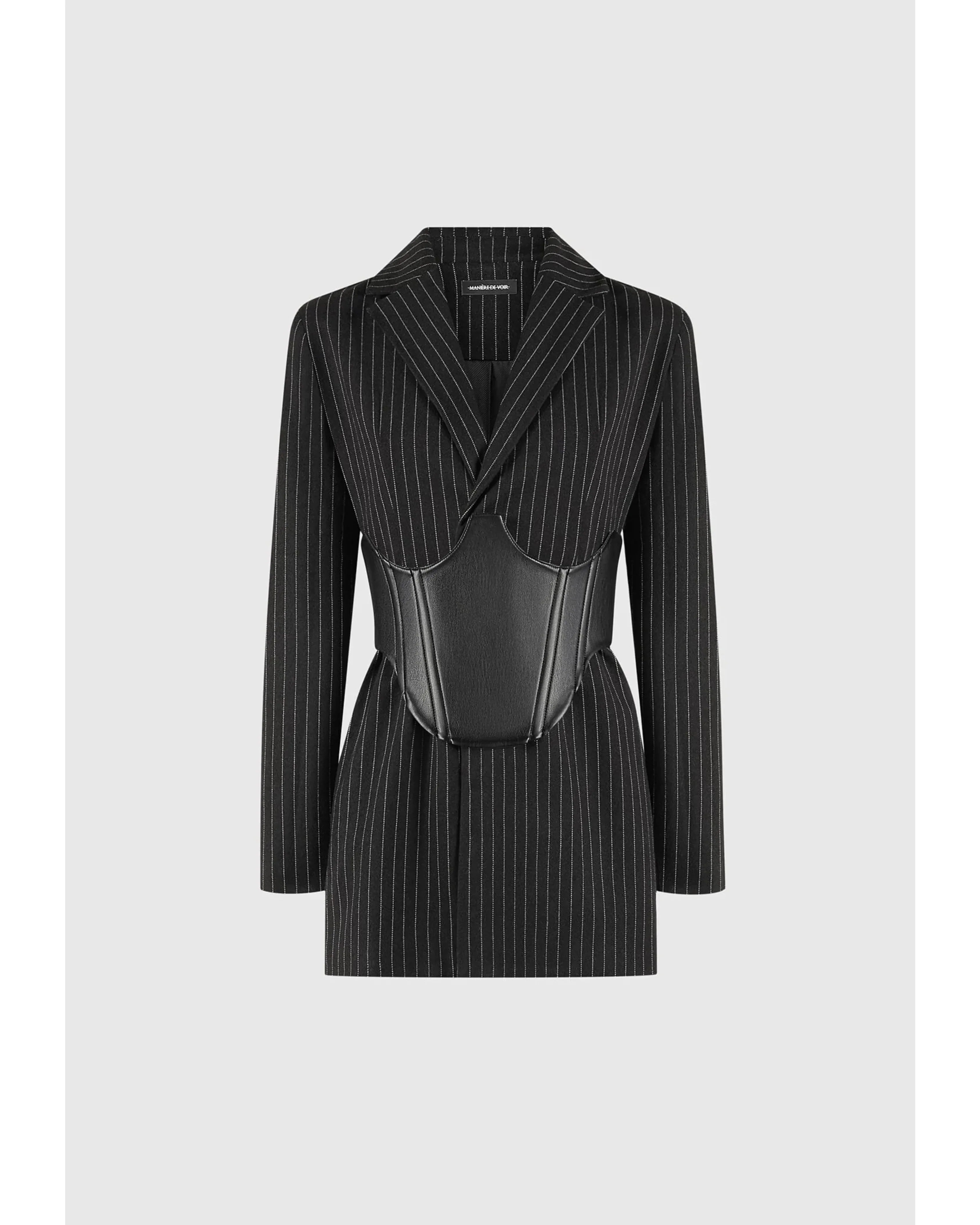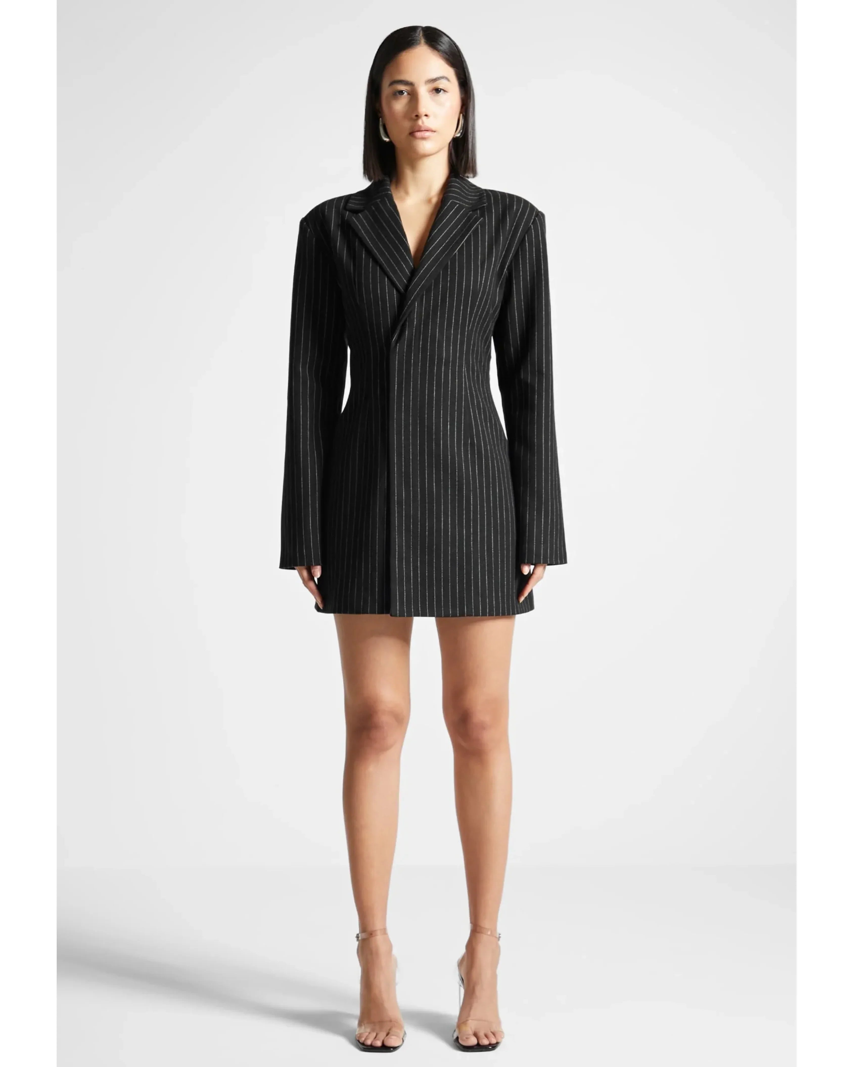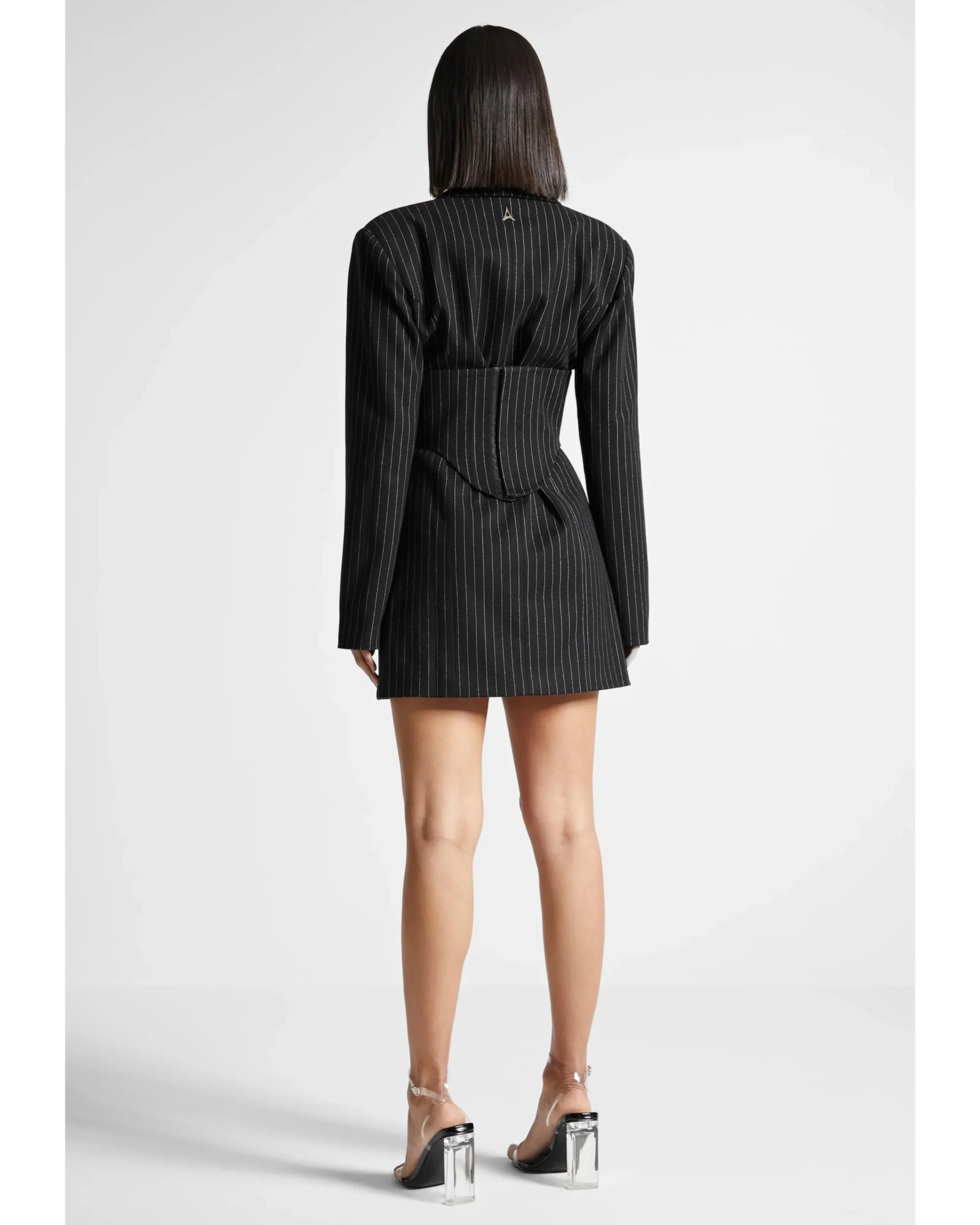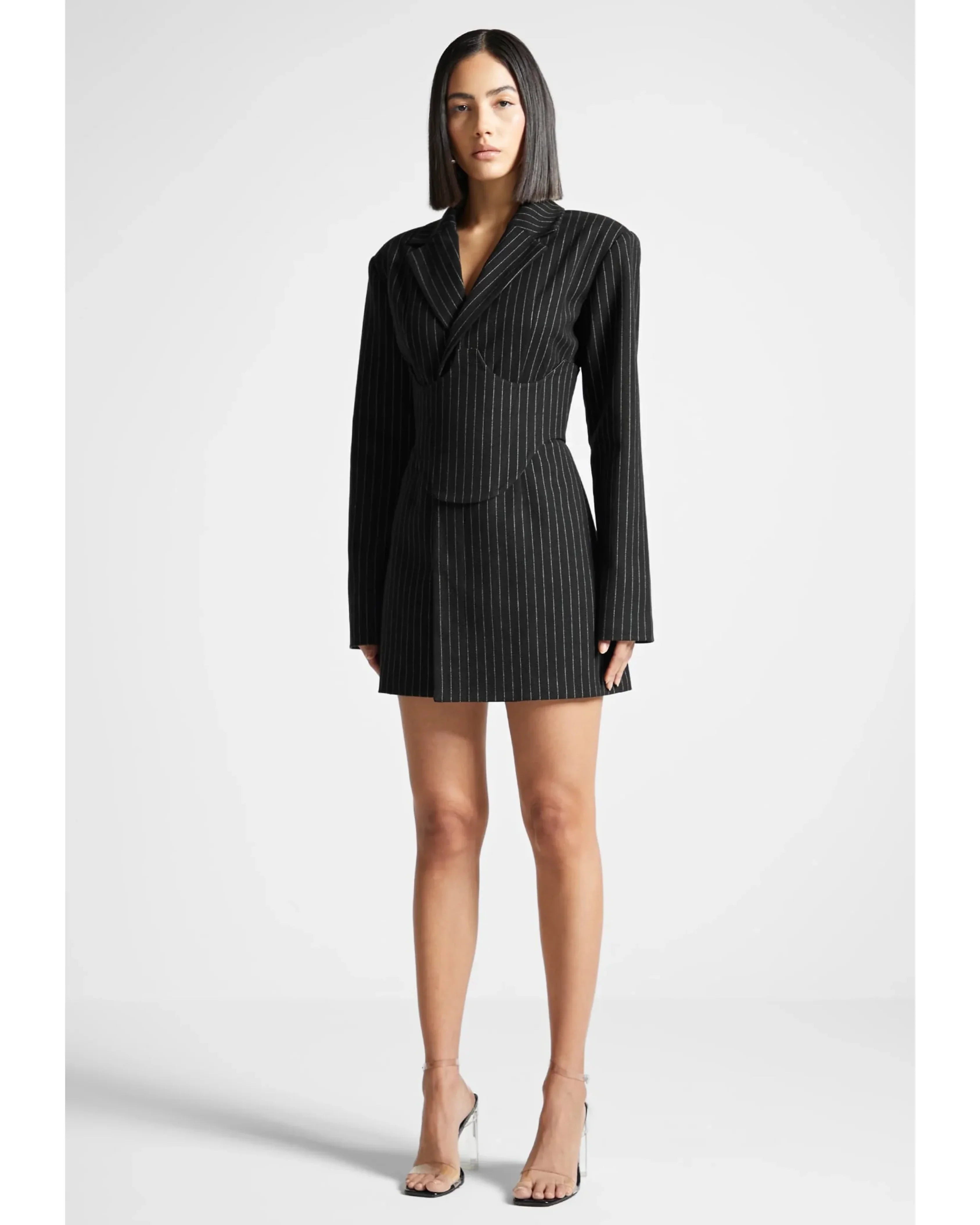 Make an impact no matter the occasion with this Pinstripe Blazer Dress with Reversible Corset. Remain classy and sophisticated all day long with its flattering shape. Perfect for the office or a night out!