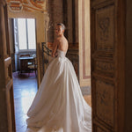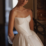 Deep round neck corset with pointed bottom and voluminous smooth fabric skirt.