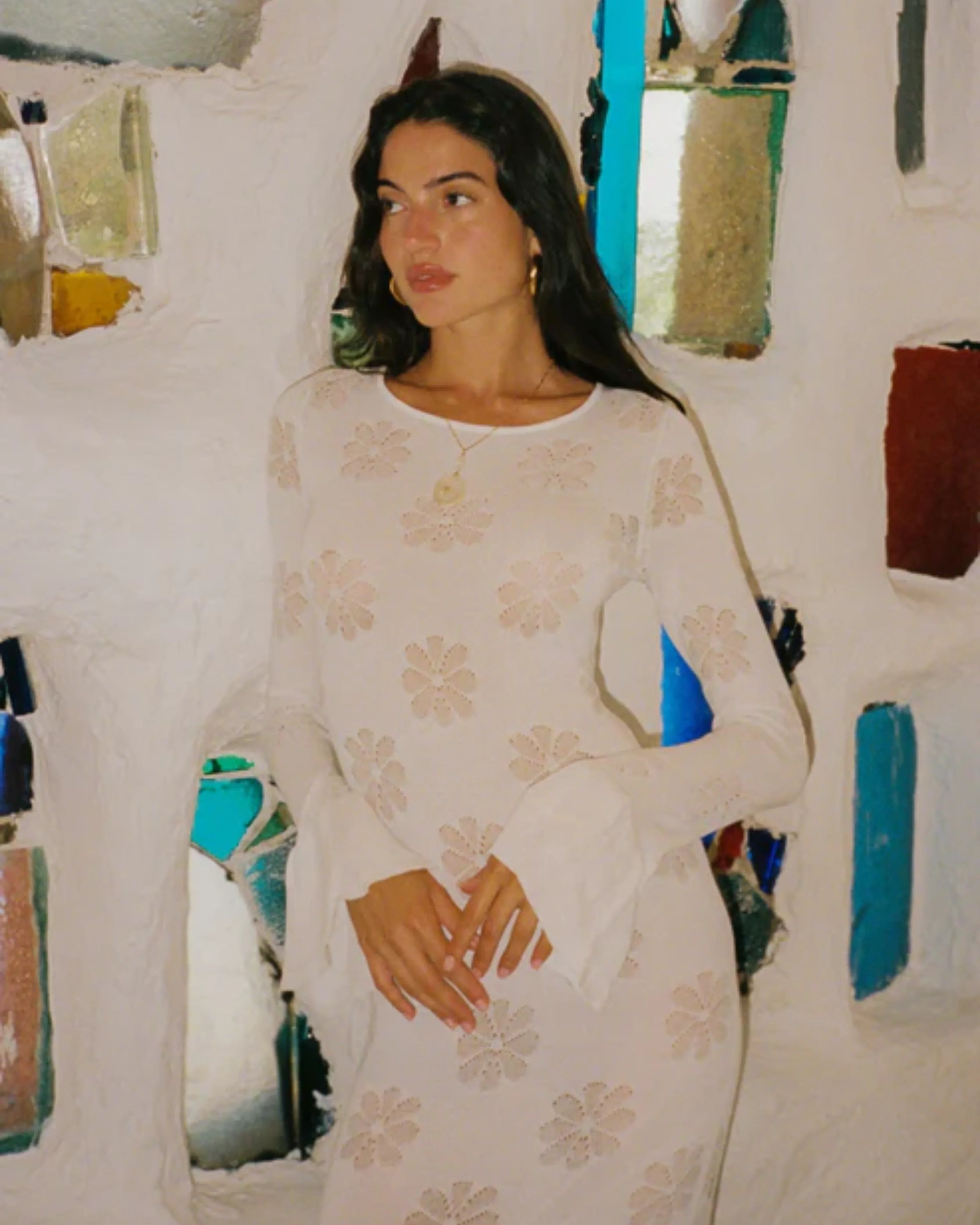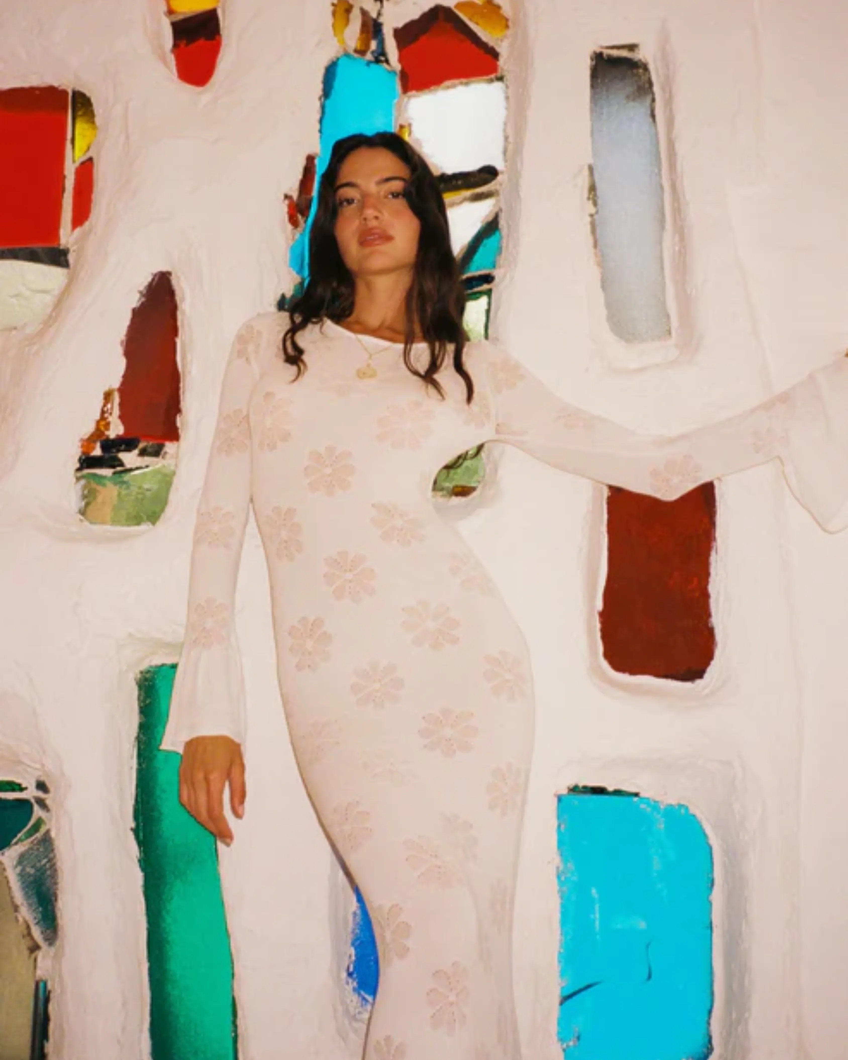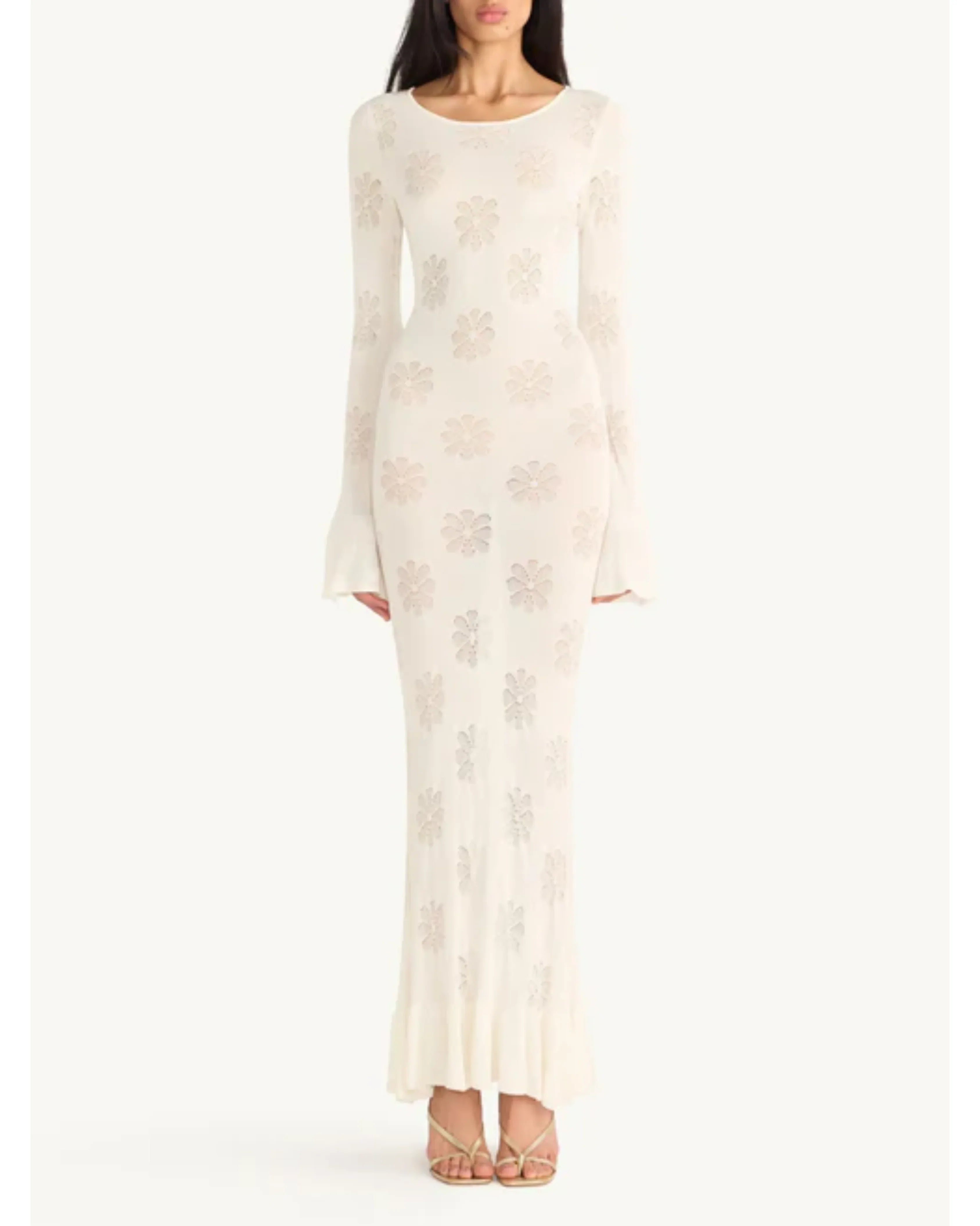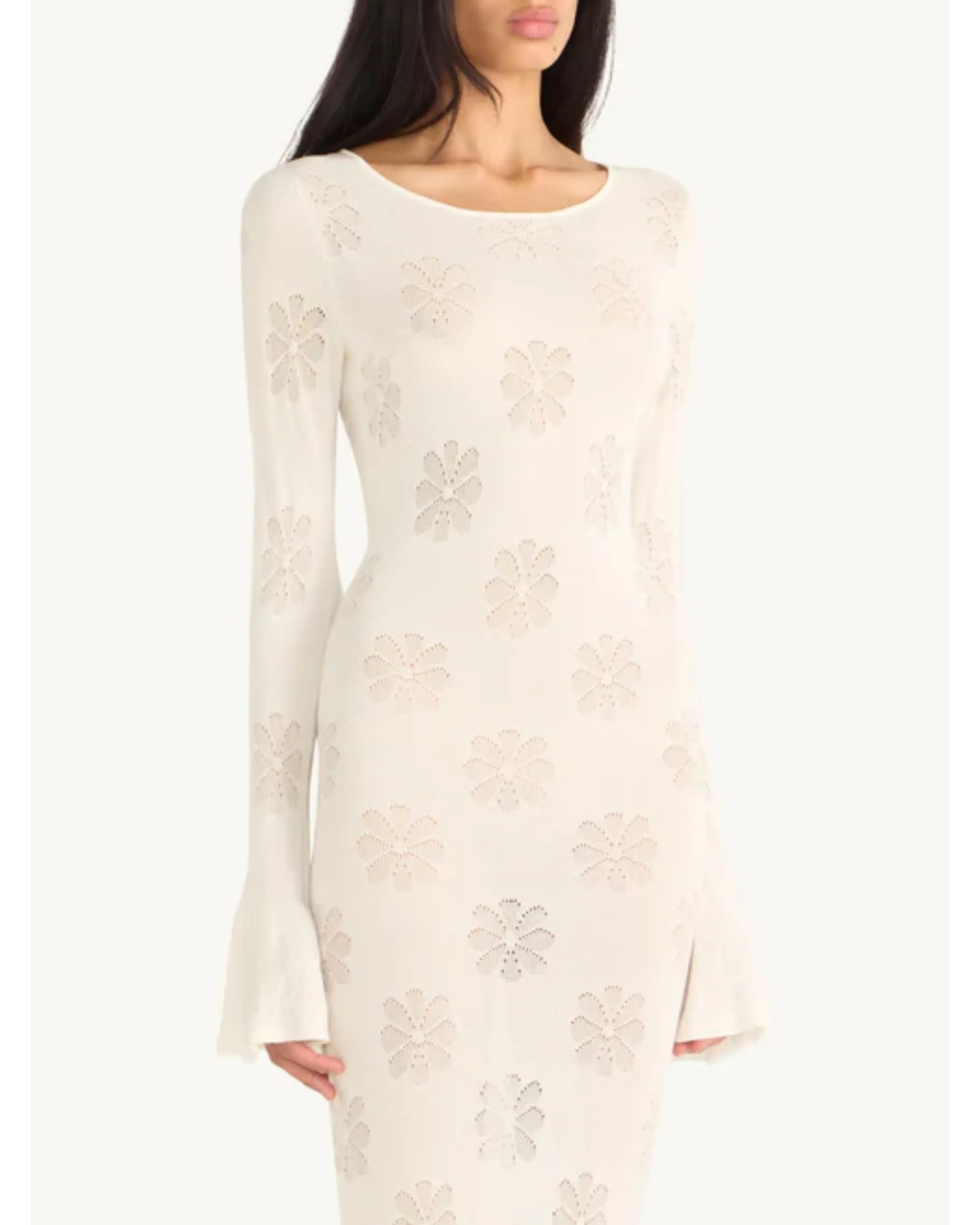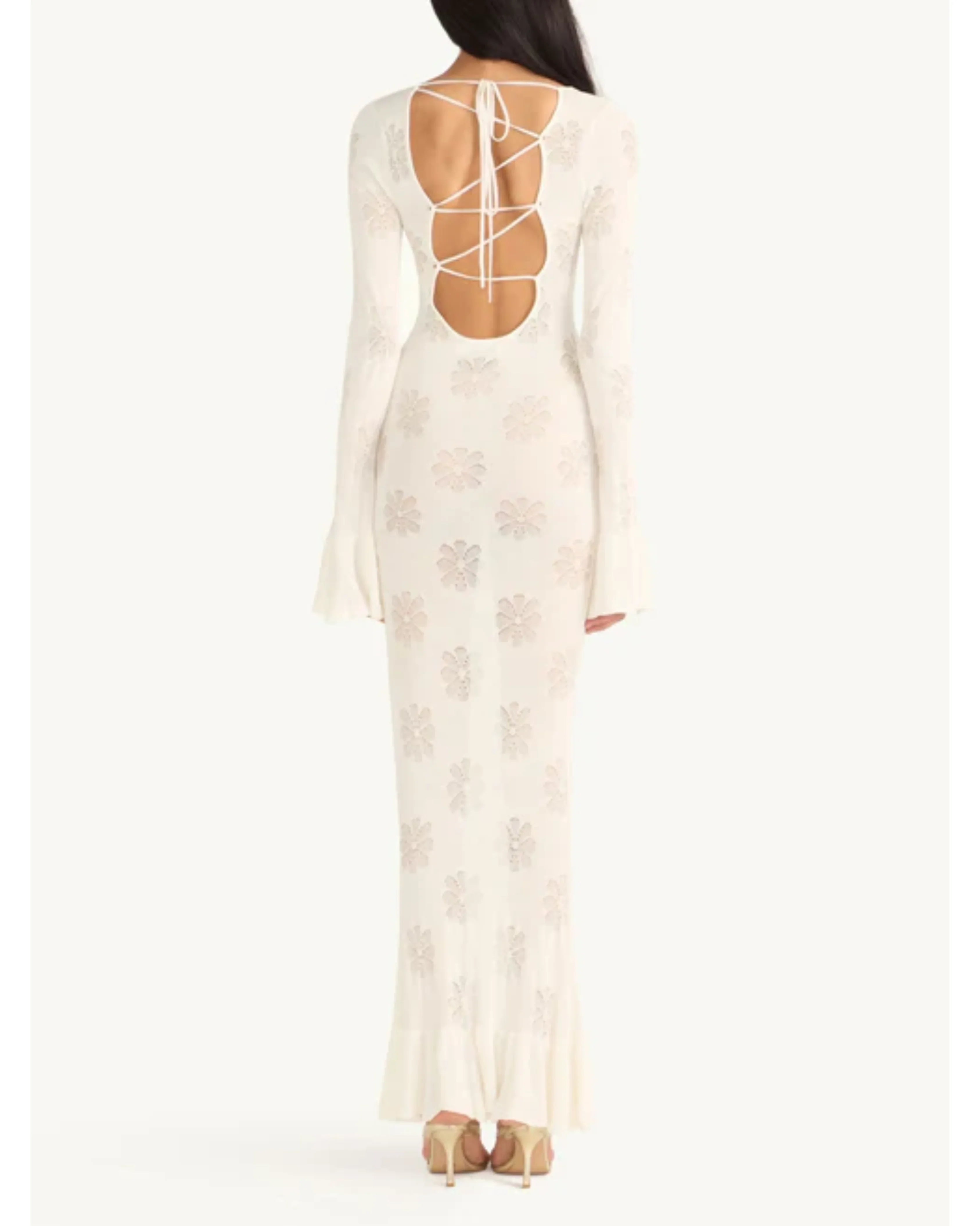 Featuring fluted long-sleeves and a lace-up back. Constructed from a fine cotton-based jacquard knit featuring our signature Delilah motif.