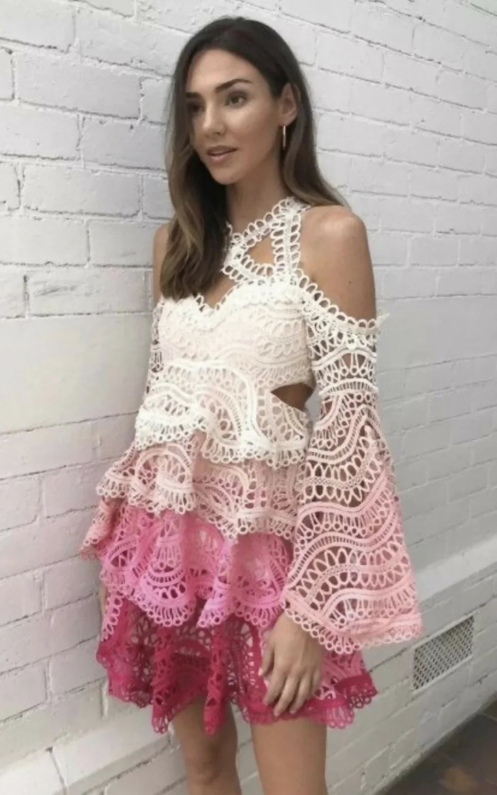 A standout piece from Thurley's AW18 Pirouette collection. Baske in this pink ombre illusion, detailing a cold shoulder style with slightly flared long sleeves and diamond cutout features throughout. This gorgeous mini is the perfect go to outfit for a day at the races or special party occasion.