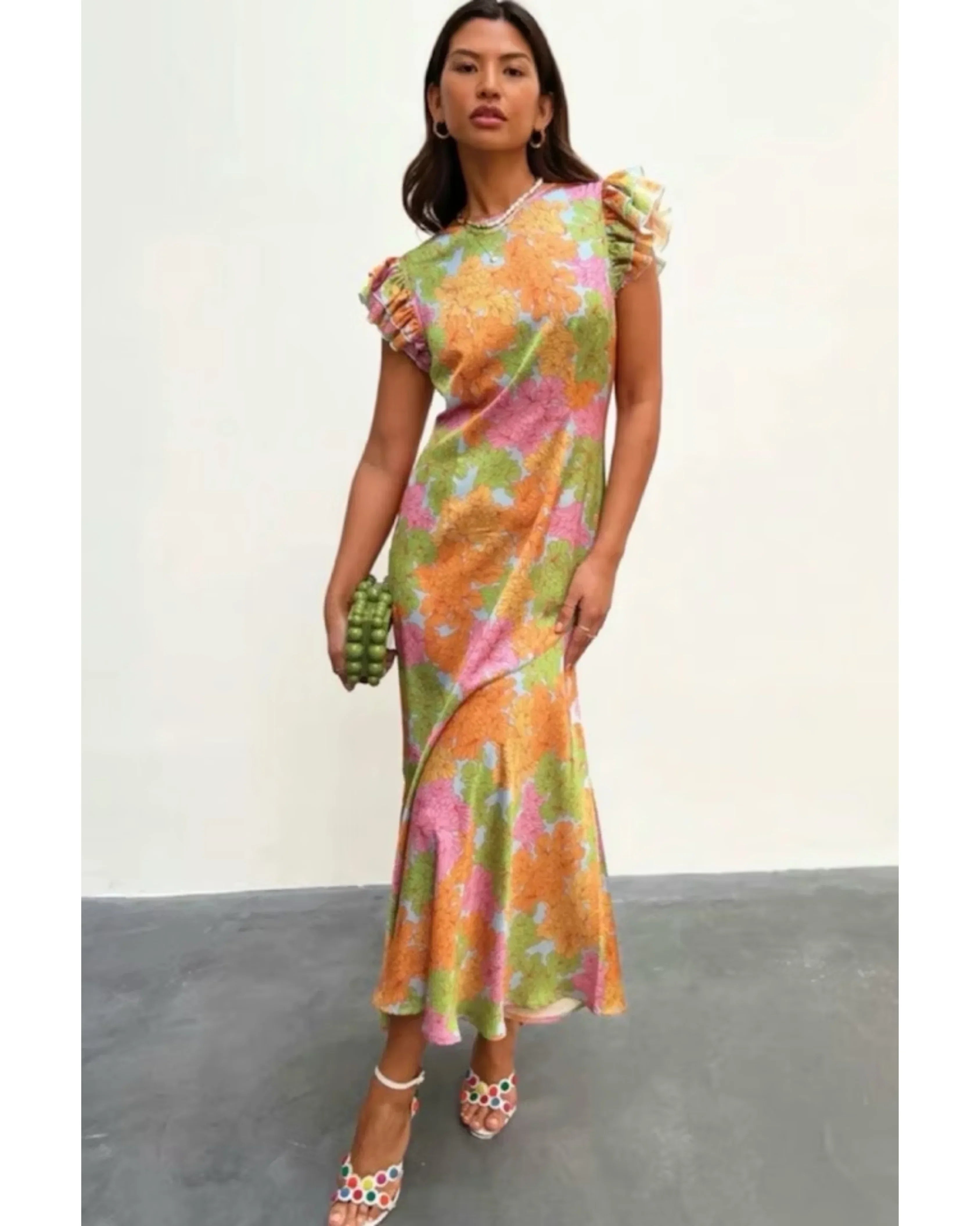 Beautiful silky dress, bold and unique pattern. Bias cut hem and ruffle sleeves make this super flattering!