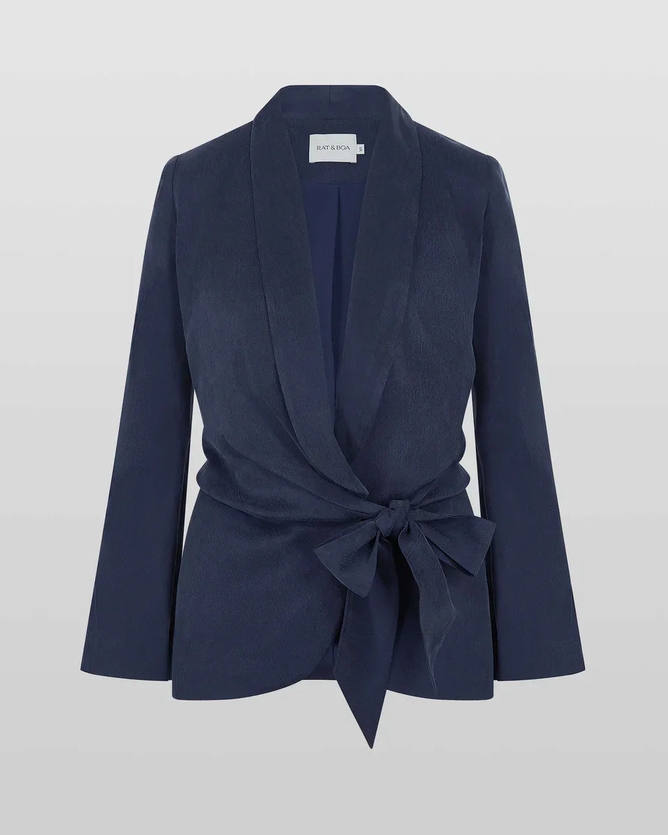 In classic navy, this oh-so-elegant jacket perfectly balances louche with pulled together. Flared sleeves, draped lapels and a cinching waist tie are signature R&B notes.