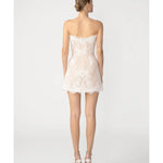 Strapless lace mini dress with fully-boned bodice featuring signature hand-tied pipa knot detail.