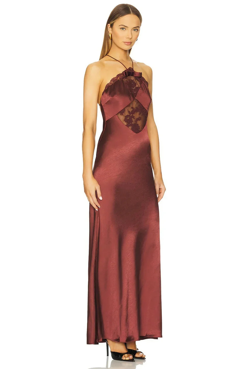 Self-portrait midweight satin halterneck dress with a smooth, pull-on fit. Partially lined and finished with a sheer mesh panel at the front topped with a bow accent, plus contrast fabric detailing for subtle texture.
