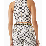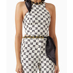 Ushering in Elisabetta Franchi's defining elegance, this slim-fit crop top is a wardrobe classic reimagined. Adorned with all-over monogram jacquard, its layered stretch-crepe makes a glamorous statement, embraced by the chain-detailed foulard neckline.
