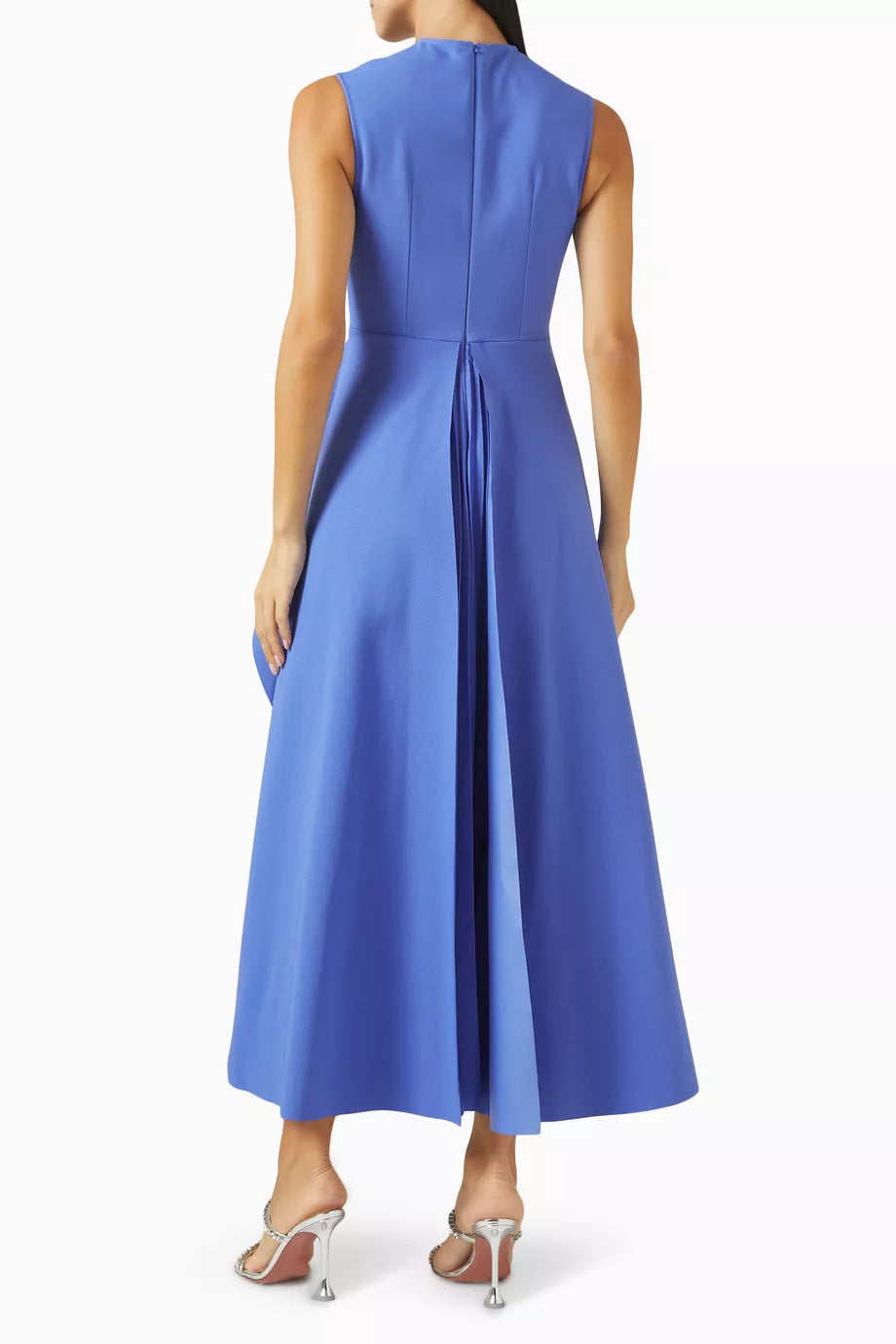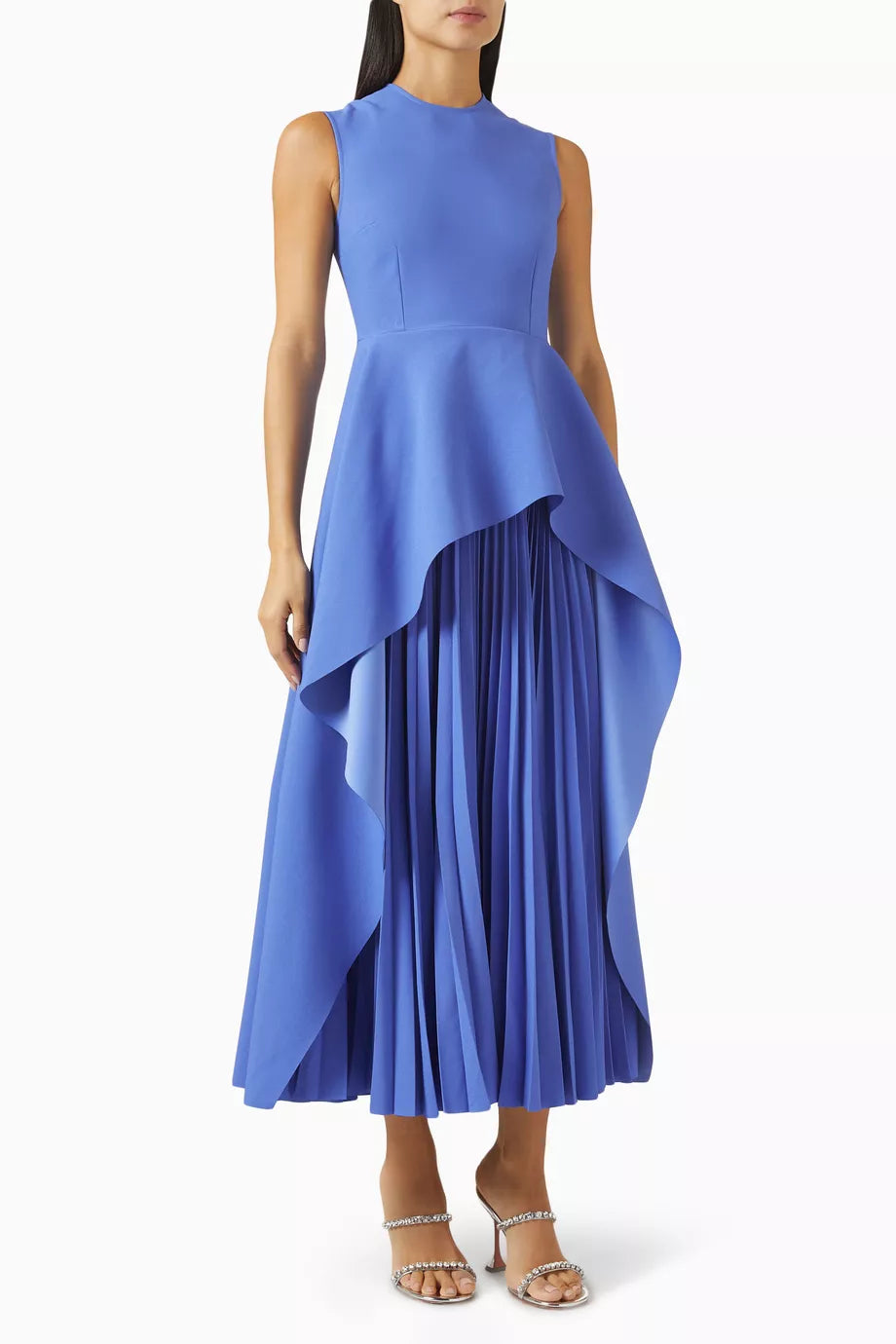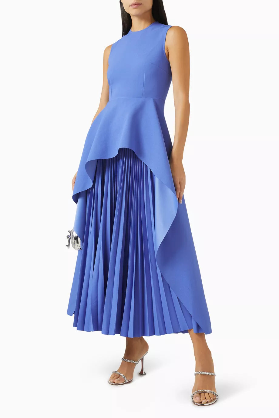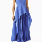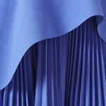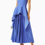 The Severny Midi dress embodies contemporary sophistication with its graceful design elements. Its silhouette boasts a chic draped asymmetric peplum that adds a touch of elegance, beautifully juxtaposed with a sunray pleated skirt in a complementary contrast.