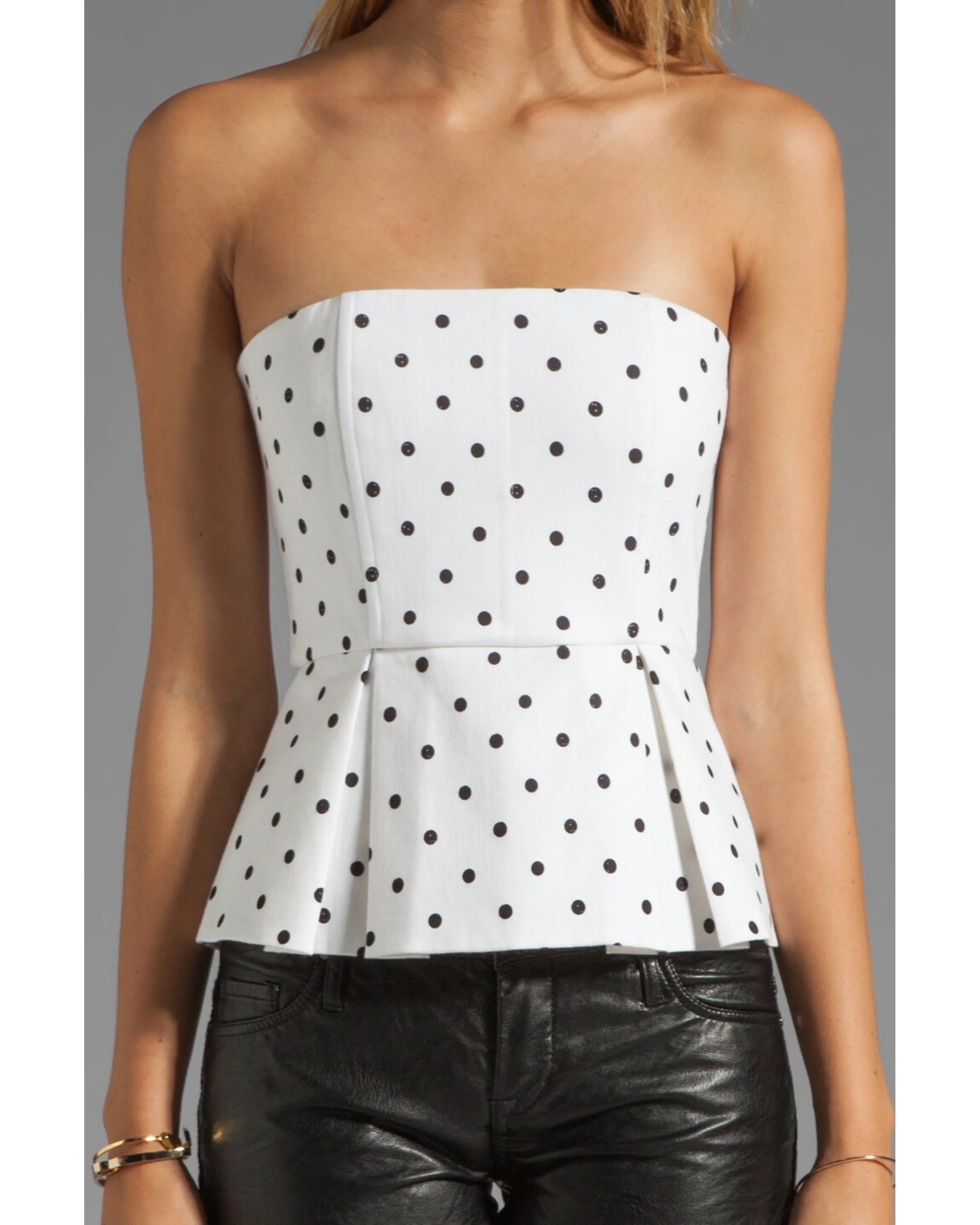 Sinclair Strapless Peplum Top in Black/White Dot Gorgeous Alice and Olivia dotted corset, new, white and black. Super sexy, perfect for summer.
