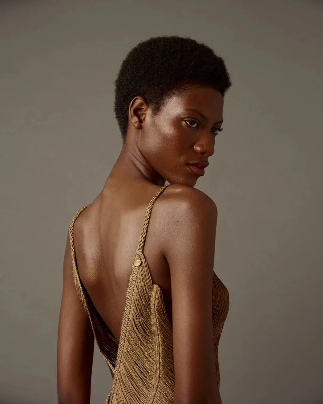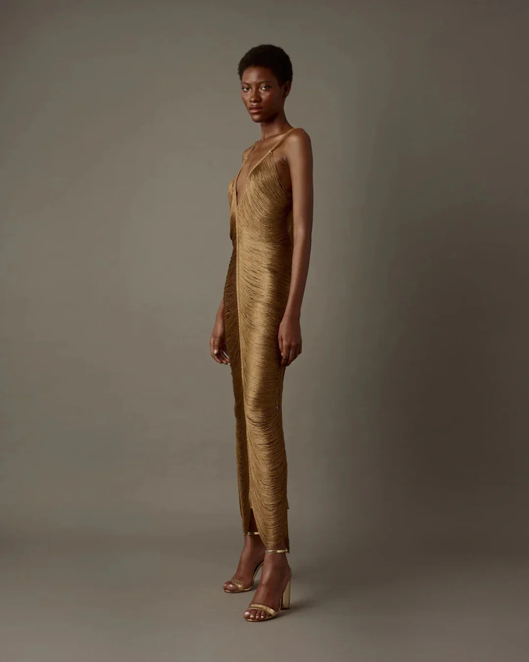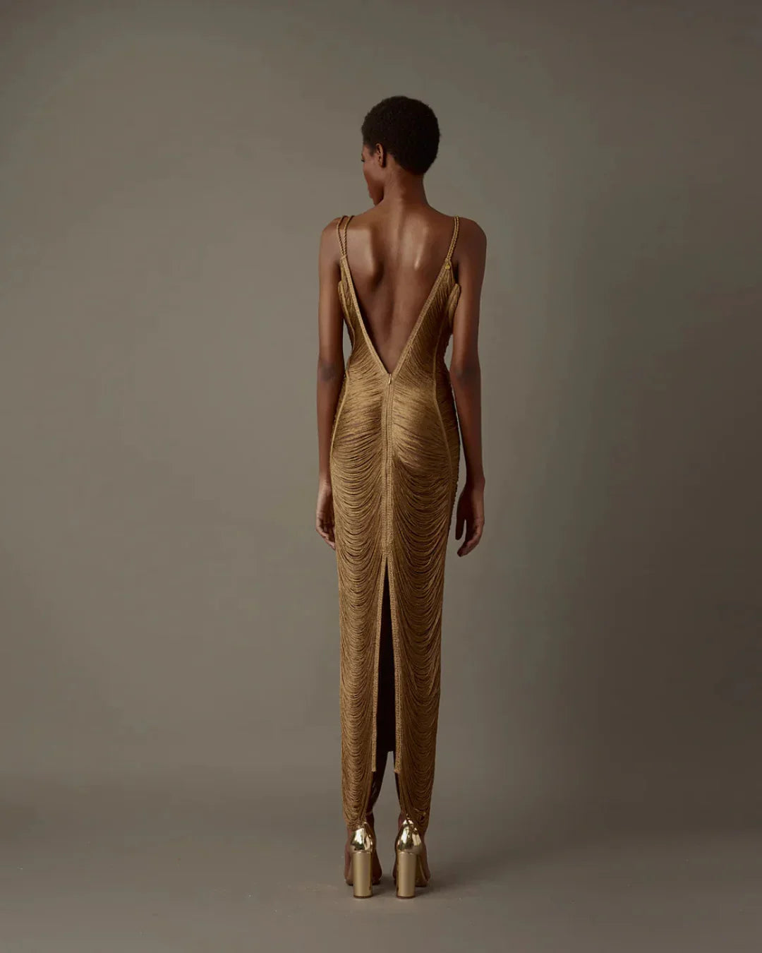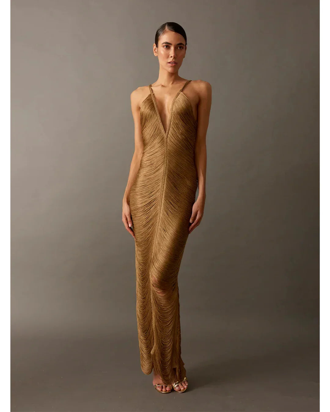 An iconic piece from our artisanal luxury line, this long dress in aged gold tone redefines the fringe art with a silhouette that hugs the body and elevates it. Each strand is hand-sewn to create a wavy movement that mimics water cascading over the skin, enhancing elegance and sensuality. The deep V neckline and open back add a touch of ethereal sophistication, while the back slit allows ease of movement and a subtle hint of boldness.