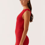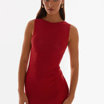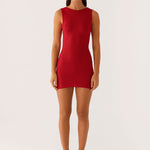 The Take Five Summer Knit Mini Dress features a high rounded neckline, a back tie for a customizable fit, and a low back design for a subtle touch of allure. Made from soft, stretchy knit fabric, this mini dress offers comfort and style for warm-weather days.