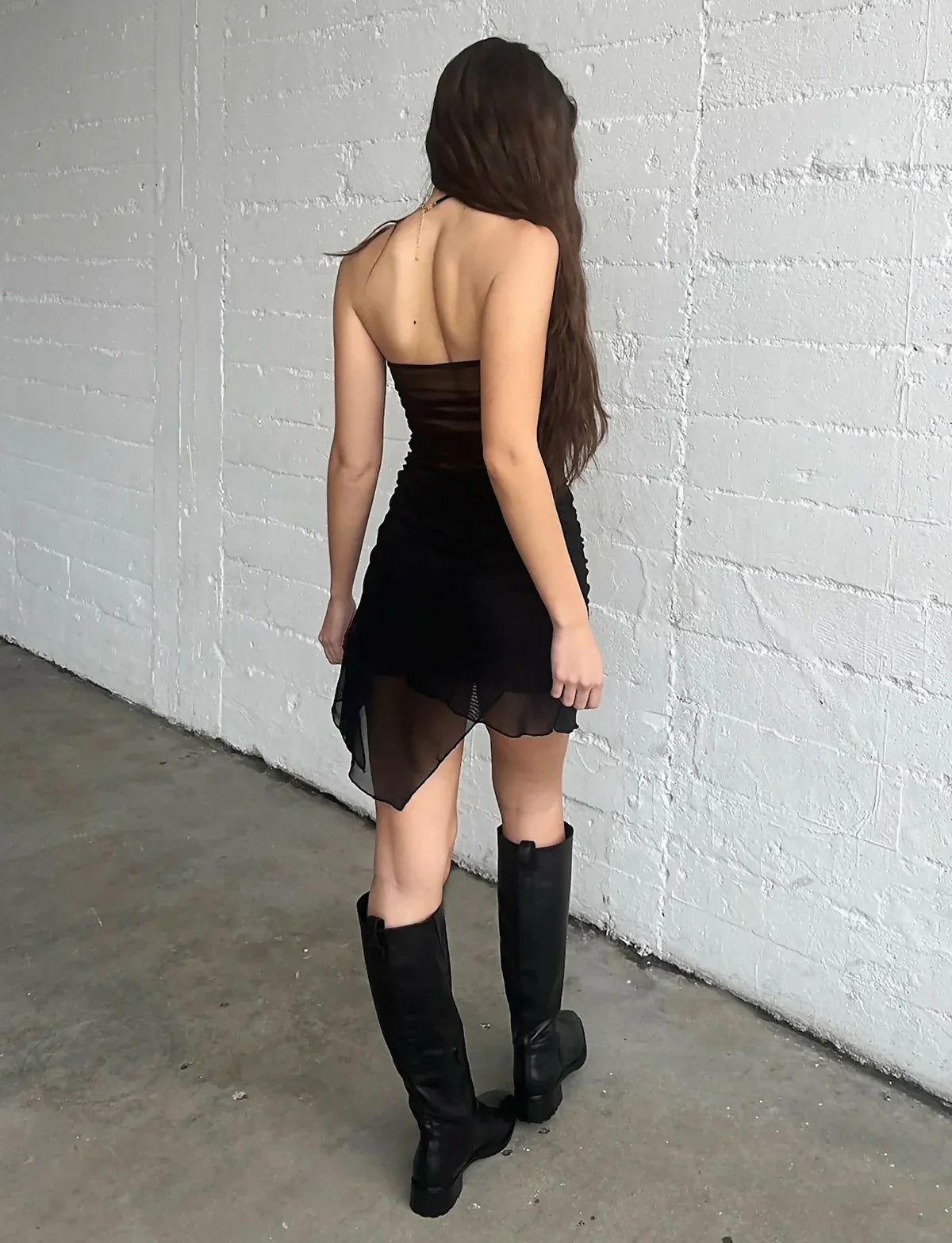 Designed to turn heads, this strapless mini dress features sheer mesh panelling and a fitted bodycon silhouette that highlights every curve. The bust is lined for coverage, while the waist, back, and lower hem remain semi-sheer for a bold, modern contrast. Finished with a double-layered hem that creates soft dimension, it’s the perfect statement piece for nights out, parties, or special events.