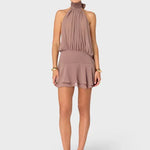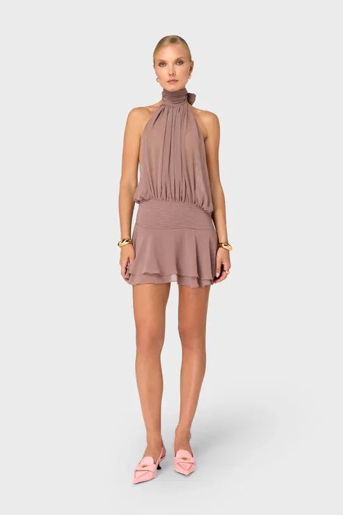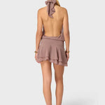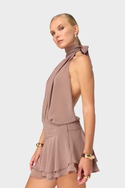 Presenting the short THEA dress made of chiffon, which features an open back with a scarf to tie around the neck.