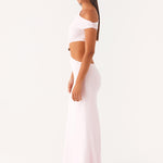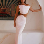 The Veronica Maxi Dress is pure sophistication with a touch of edge. Featuring a one-shoulder design, sleek hardware detailing, and a flowing maxi length, it’s the perfect dress for those unforgettable nights under the stars.