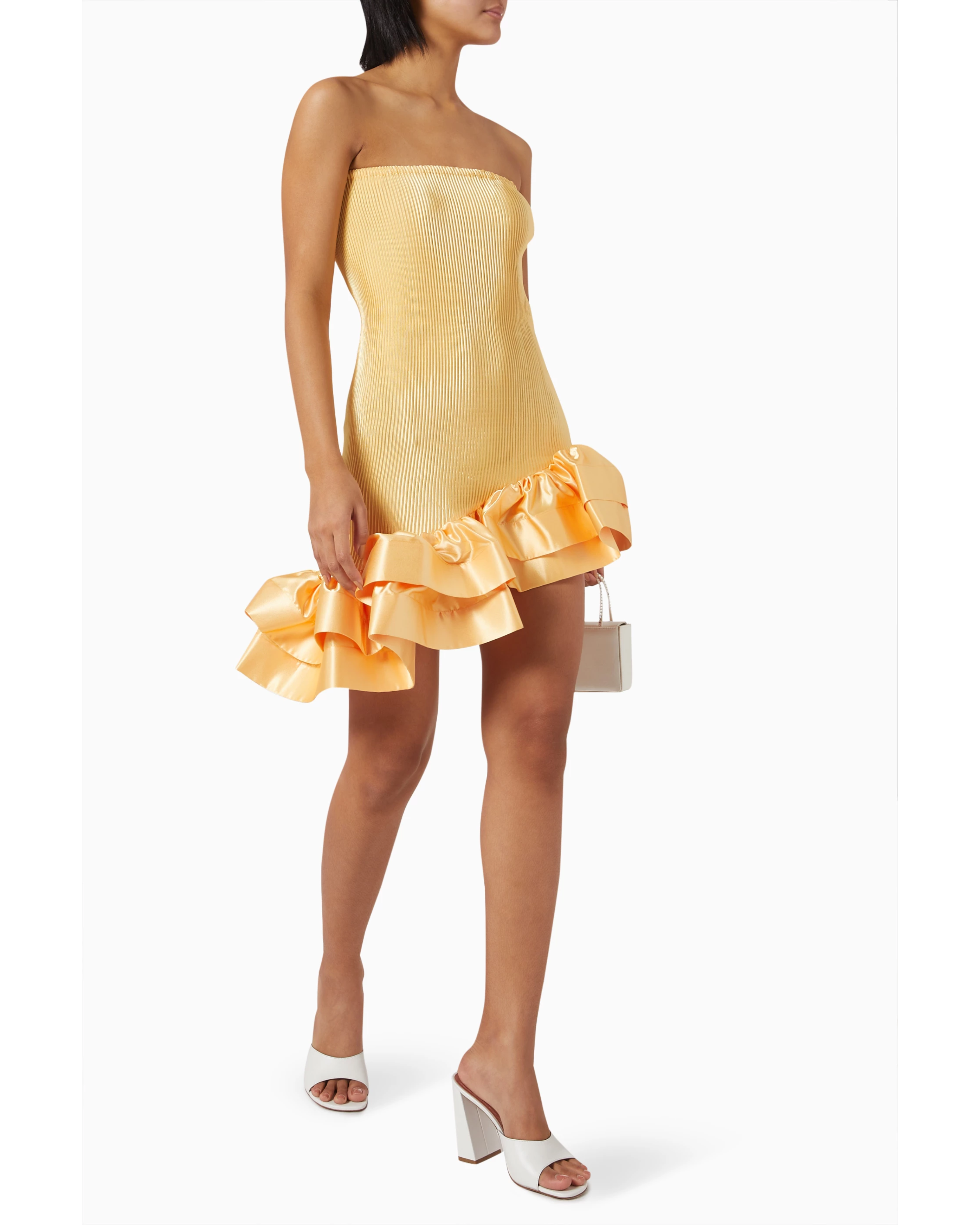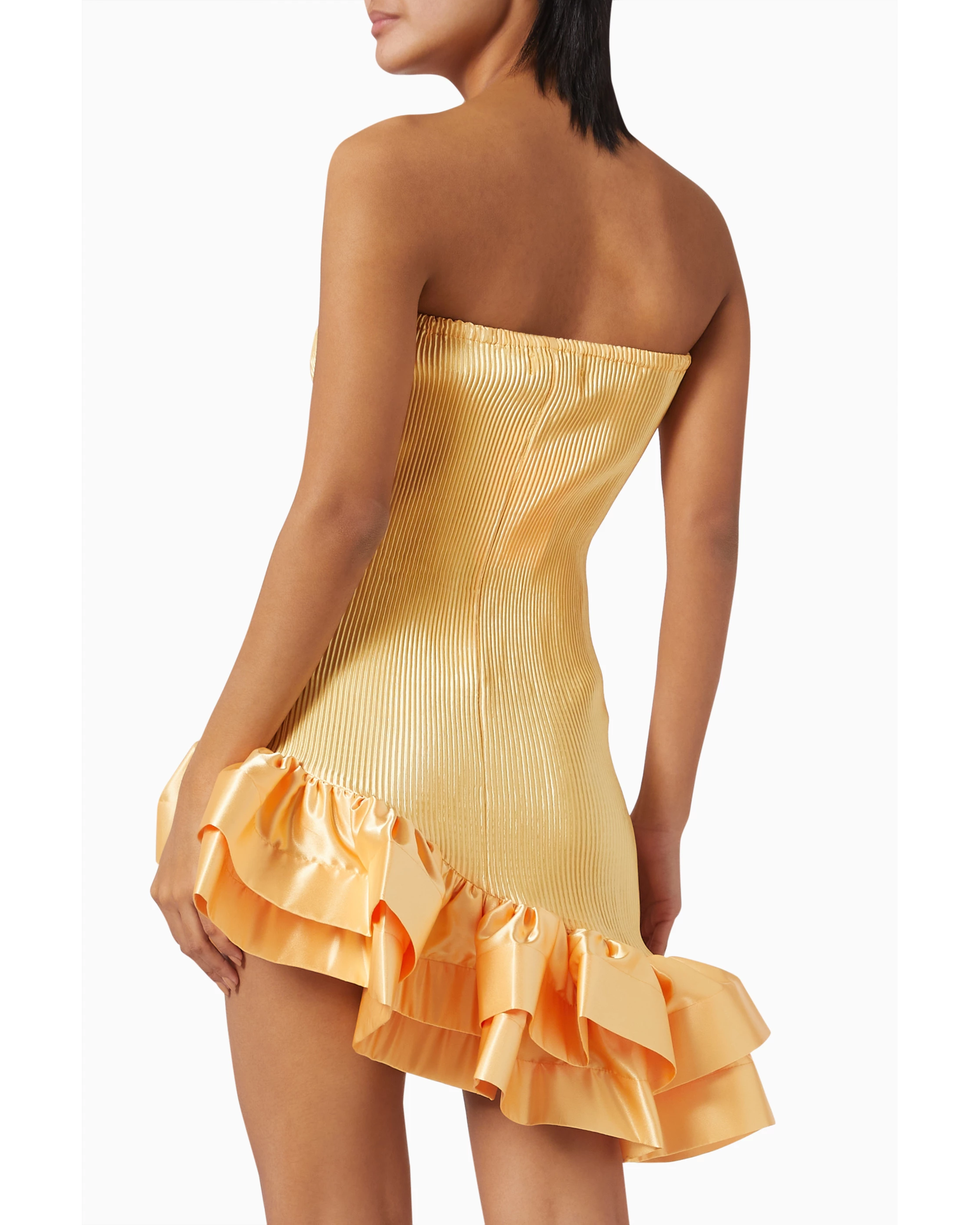 Striking a balance between refined and rebellious, the L’IDÉE Volant dress features a sleek, sculpted silhouette and a ruffle-trimmed mini hemline that moves with energy. The strapless neckline and shimmer-pleated finish make this piece a go-to for nights that call for a little extra flair.