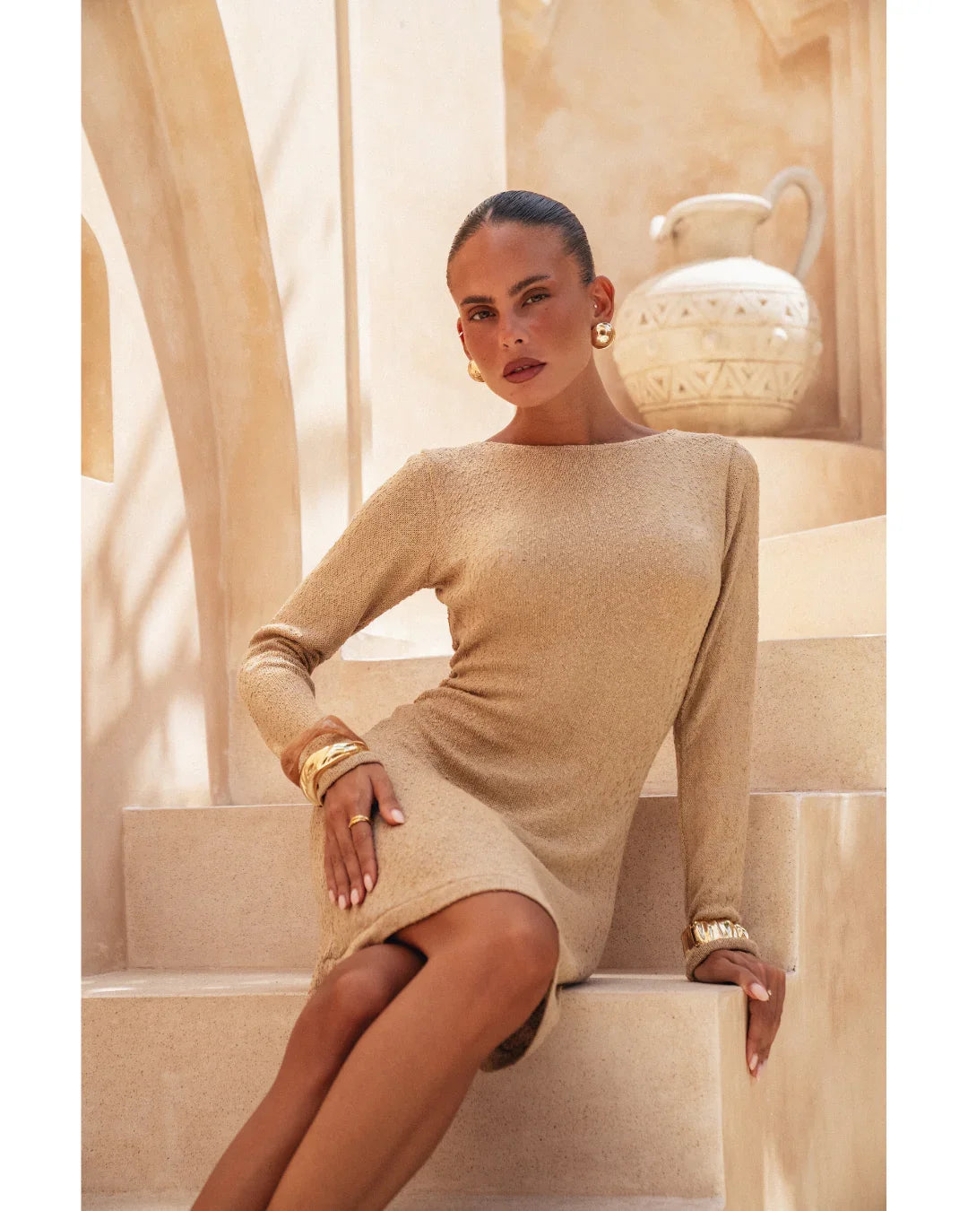 Yasmin is the collection’s shortest silhouette — youthful, free, and sophisticated. With its open back and matte-gold tie details, it’s designed for sun-drenched days and warm desert nights.