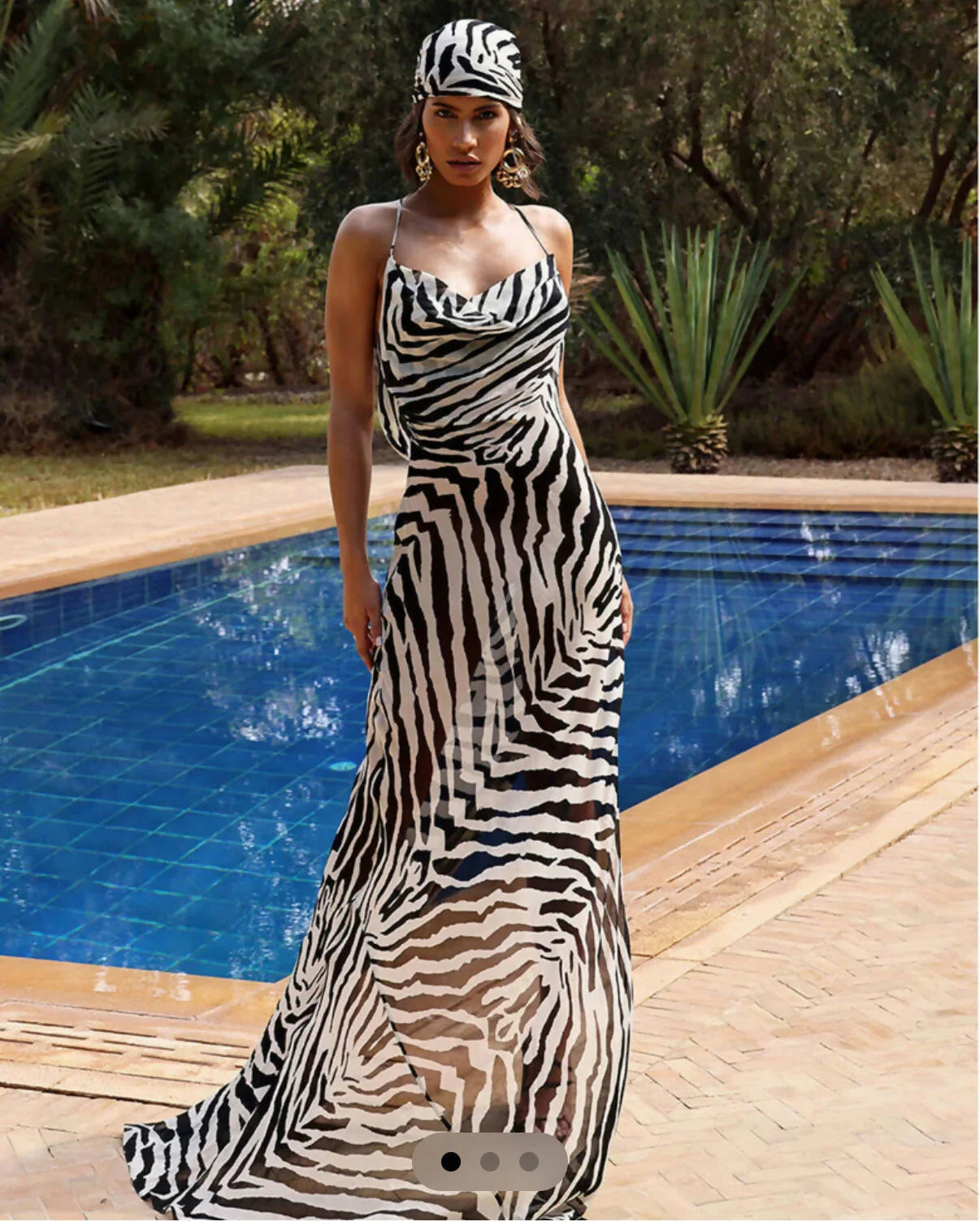 Embrace the magic of monochrome in the Zinnia dress. Crafted in bold zebra print, this floor-skimming maxi features a draped cowl neckline, elegant cross-strap back, and a side slit skirt for a striking finish. A statement style designed for dramatic entrances.