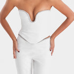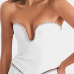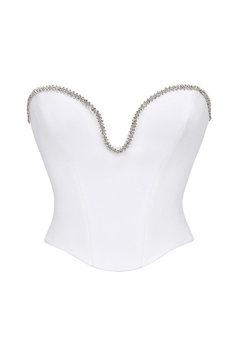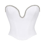- Sleek and chic, our plunge neck corset is trimmed with light catching crystals to the edge that elevate this simple piece. Zipping to the back for easy on, it's fully lined throughout for a smooth fit.