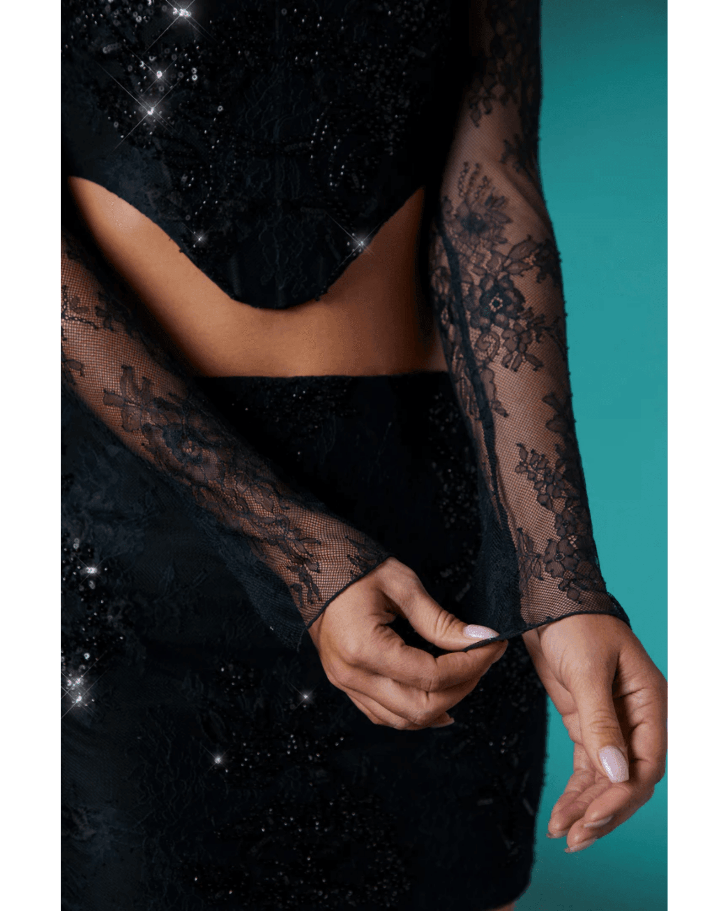Our vintage lace inspired glamorous separate designed to create the perfect festive co-ord. Cut from our all new embellished lace fabric in two classic colourways, Romy is a bodycon silhouette with a low waistband for an on trend, 90's inspired fit.