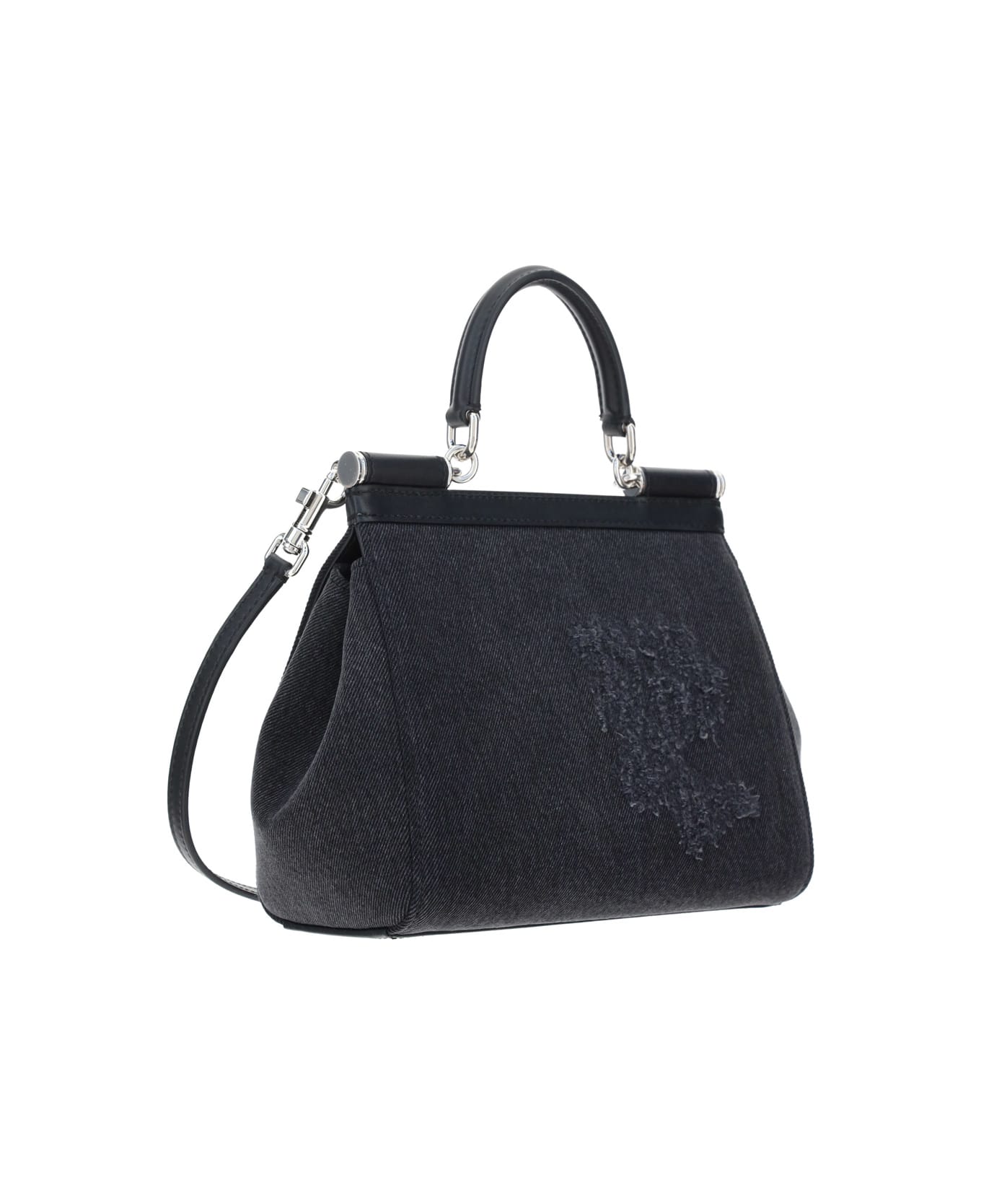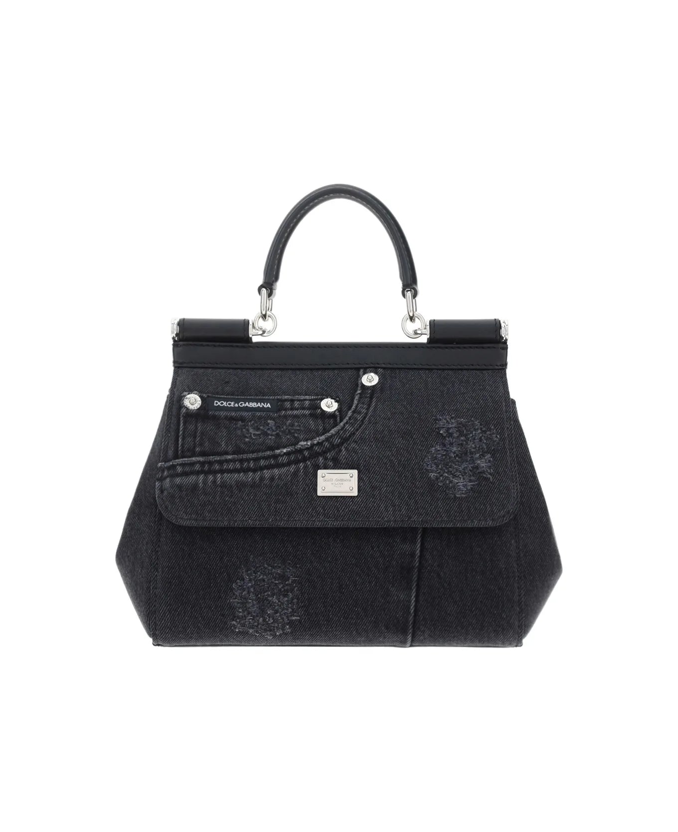 Cotton sicily handbag by dolce&gabbana, denim design, single rigid leather handle, front closure with double magnetic button, adjustable and removable leather shoulder strap, metal plaque with iconic brand signature embossed on the front, metal feet at the base of the bag as support.