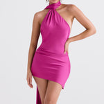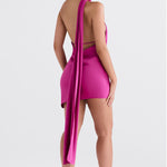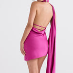 Our 'Aida' mini dress is draped, gathered and elegant to create an ultra feminine silhouette. Made from our lustrous duchess satin in a striking hot pink hue, it has a one shoulder cut and designed with a flattering asymmetric hem.