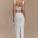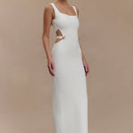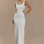 Introducing the ALYSANNE Cut Out Knit Maxi Dress, a stunning blend of elegance and modern design. This dress features a striking square neckline that beautifully frames the collarbone, while the back cutout adds a bold yet sophisticated detail. A secure back waist strap enhances your silhouette, complemented by a charming button detail at the waist that elevates the overall look. The centre back leg split introduces a hint of allure, while the straight skirt shape maintains a timeless appeal. Unlined for a lightweight feel, this dress is versatile enough for any occasion, from daytime events to evening gatherings.