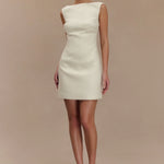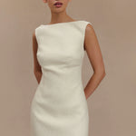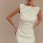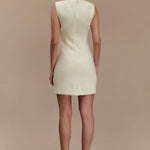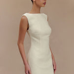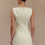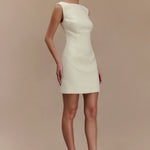 ANGELA is a sleeveless mini dress crafted with a chic boucle fabrication, featuring a clean boat neckline and an A-line skirt. Crisp and modern, the front showcases contoured seam lines for a fresh, fitted look. The dress closes with an invisible zip, keeping the silhouette smooth, sleek, and sexy. A beautiful blend of stylish and classy, this versatile dress is a wardrobe essential.