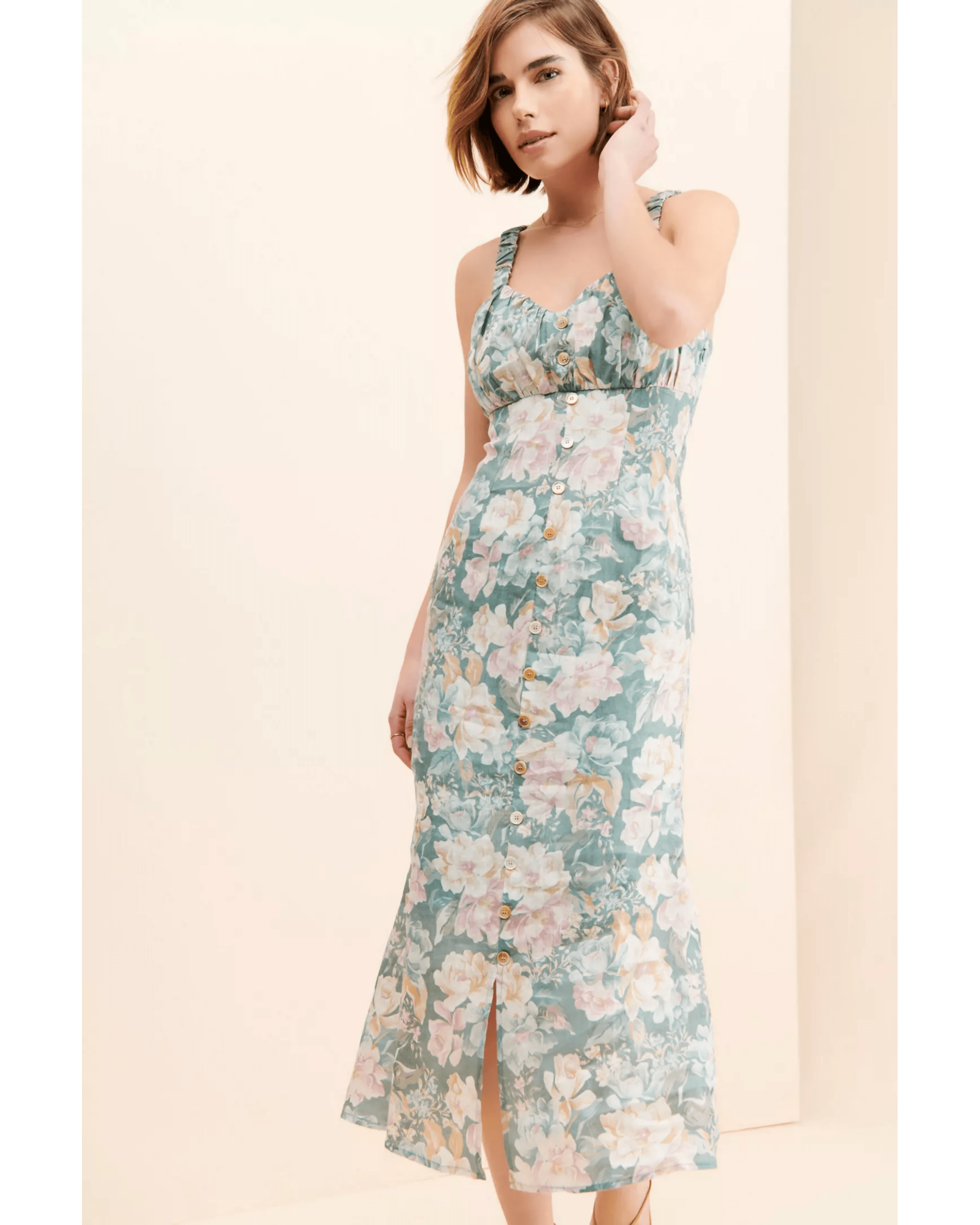 Super unique and flattering with elastic spaghetti straps, sweetheart neckline, subtle mermaid cut, and decorative mother of pearl buttons that go all the way down the front. Super soft linen and fully lined with hidden side zipper. Gorgeously unique, super comfortable well made dress that was designed in Australia.