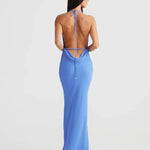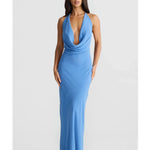 The Lopez dress is a MELANI The Label design made from lightweight, ethereal chiffon with a bias cut for a smooth, flattering silhouette. It features a timeless, plunging cowl neckline at the front and a dramatic, open backless design. The fully lined, midi-length dress is designed for a sophisticated and elegant look, capturing a blend of classic allure and modern style, often incorporating features like self-tie strings for the back or adjustable strap.