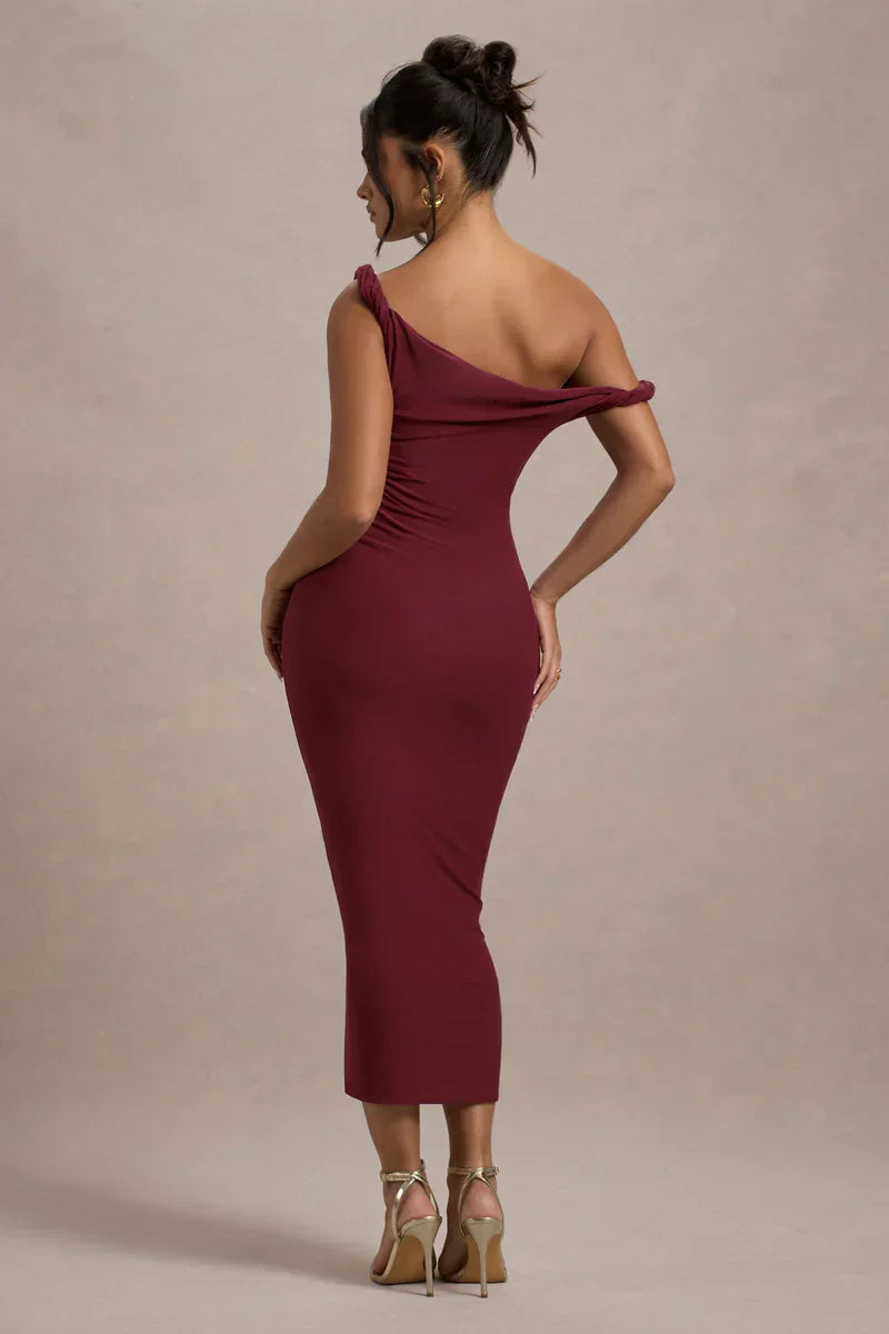 Minimalistic with a twist, say hello to Salome. This midi dress in berry has been crafted in our premium brushed jersey for figure-flattering comfort. Detailed with an asymmetric twisted neckline for a new season shape, keep Salome at the forefront with a sleek updo and gold accents.