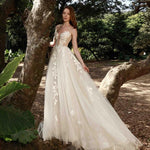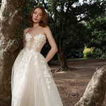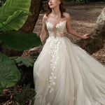 Immerse yourself in the enchanting details of this unique A-line wedding dress. Each lace applique is meticulously placed, ensuring a truly individual and bespoke piece.