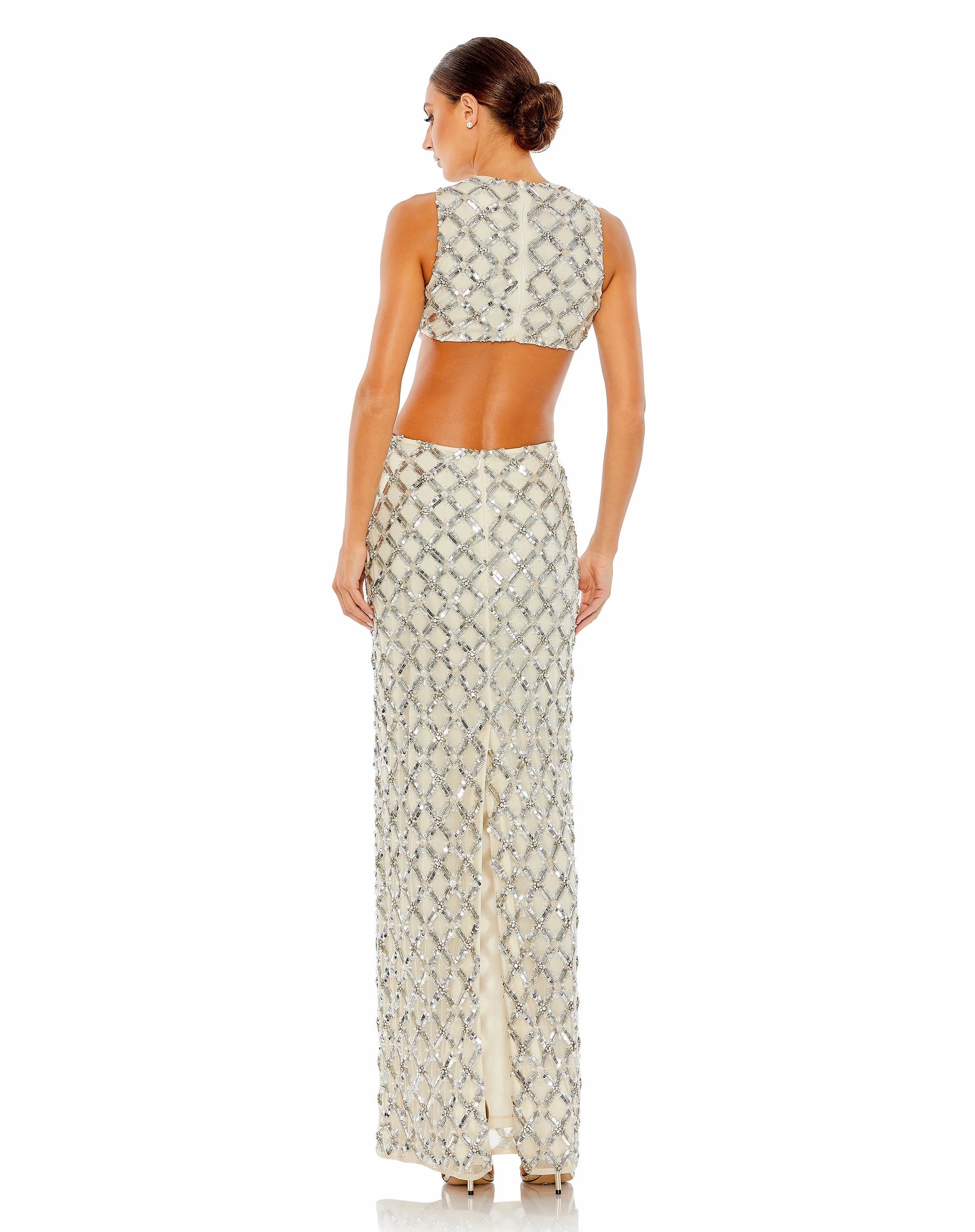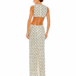 A striking statement in silver, this column gown is designed to turn heads. Featuring an intricate lattice embellishment that catches the light beautifully, the silhouette skims the body for a sleek, elongated finish. The modern cut-out detail at the waist adds a bold edge, while the high neckline keeps the look refined and balanced. Finished with a subtle back slit for ease of movement, this gown is perfect for black-tie events, weddings, and evening occasions where effortless glamour is key.