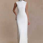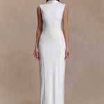 The WISTERIA Slinky Maxi Dress With Scarf is a refined silhouette with subtle drama. Featuring a sleek boat neckline and princess seam lines for shaping, it sculpts the frame in a fitted bodycon cut. Designed with a flowing scarf detail for versatile styling draped, wrapped, or left cascading, it’s finished with a back leg split for ease of movement. Fully lined and cut to a maxi length, this dress is both classic and sophisticated.