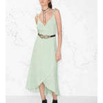 Feminine dress featuring a sweet wrap design and chic frill details on the shoulder straps.