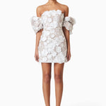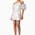 Indulge in exquisite femininity with our Perry Embellished Mini Dress in Ivory, a captivating ode to timeless beauty and sophistication. Crafted to perfection, this enchanting piece features delicate floral lace intricately embellished with enchanting 3D flowers.