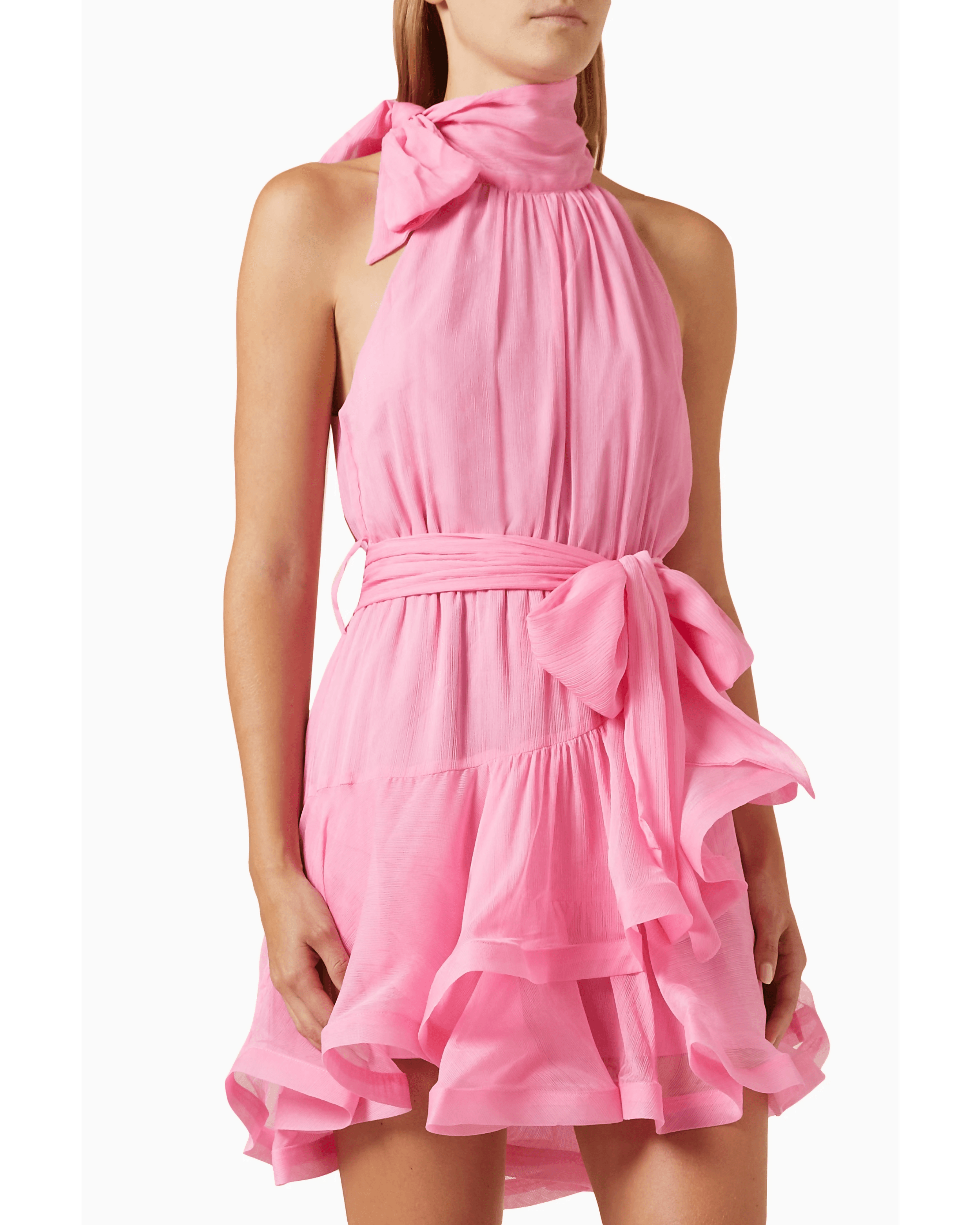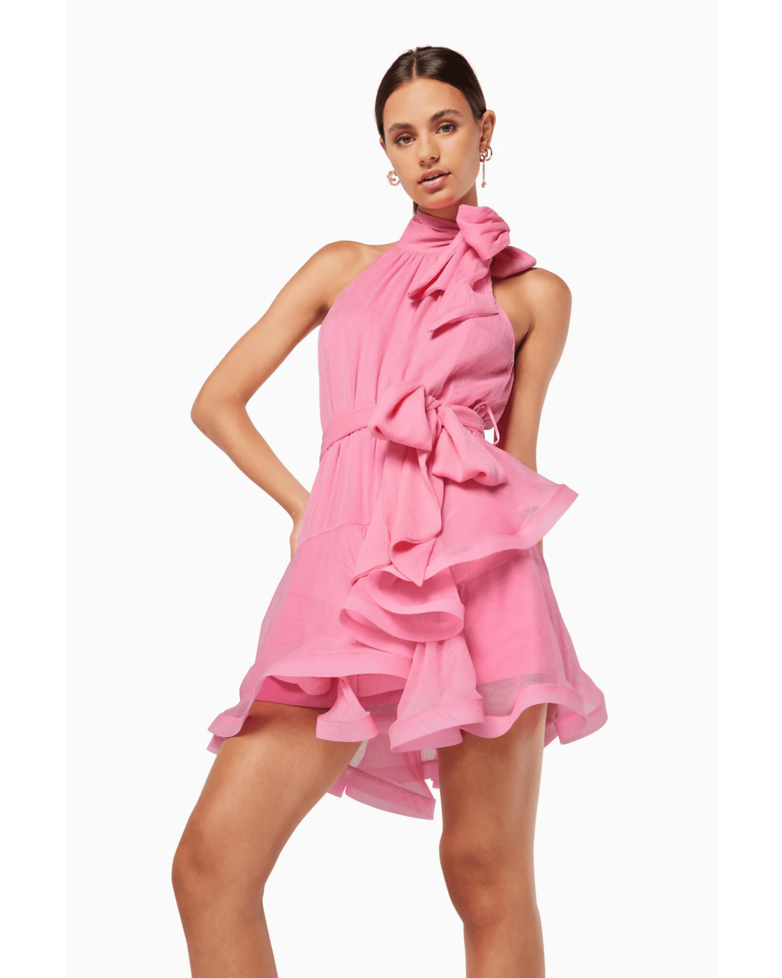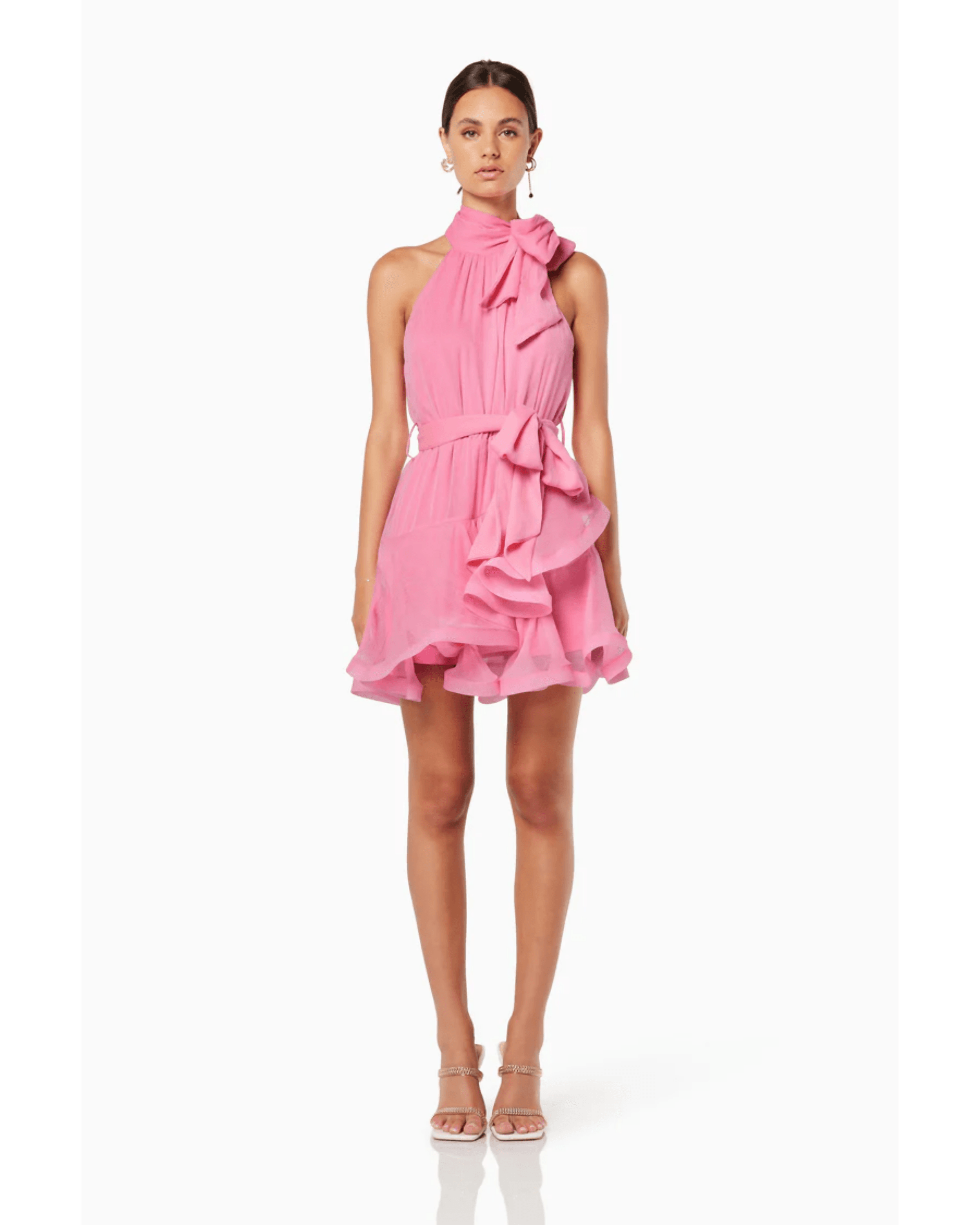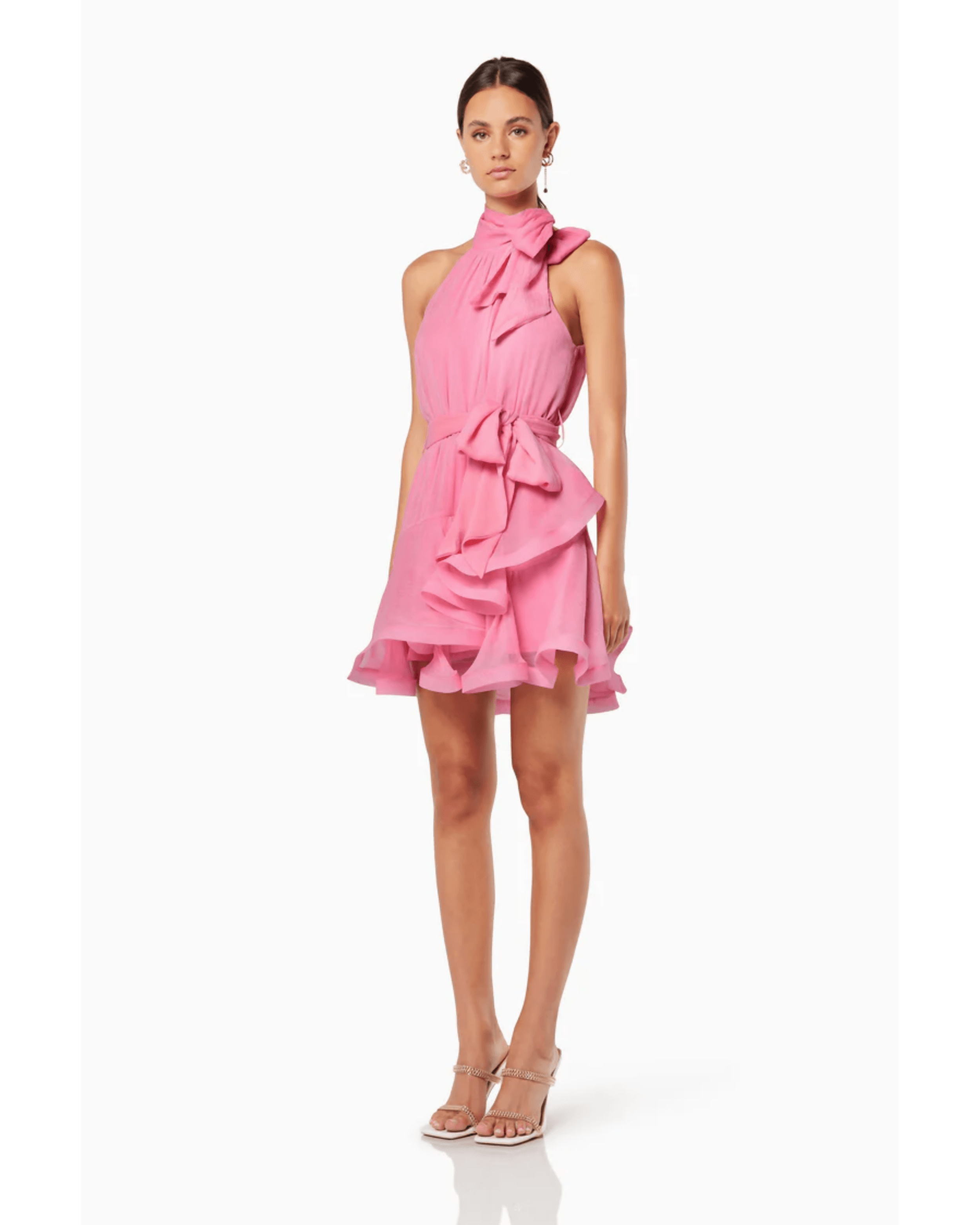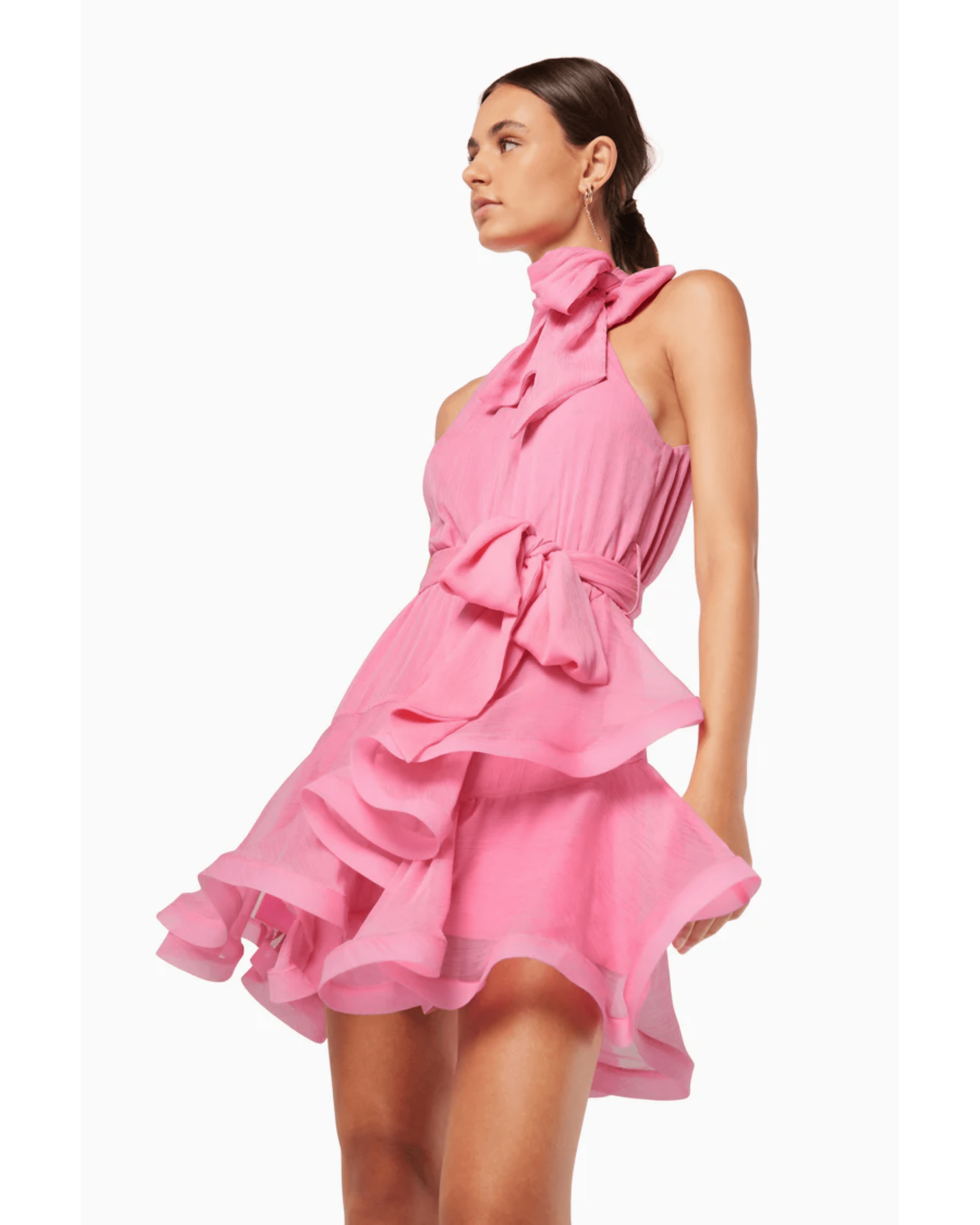 Get ready to be the life of the party with the Elliat Swan Mini Dress. This high-necked stunner with a charming bow detail is the ultimate party-ready outfit. Its sleeveless design will keep you cool and comfortable as you dance the night away. The waist-cinching belt ensures a flattering and head-turning look, and the side zipper makes slipping into this beauty a breeze. And let's not forget the playful ruffled skirt that will have you twirling with joy on the dance floor.