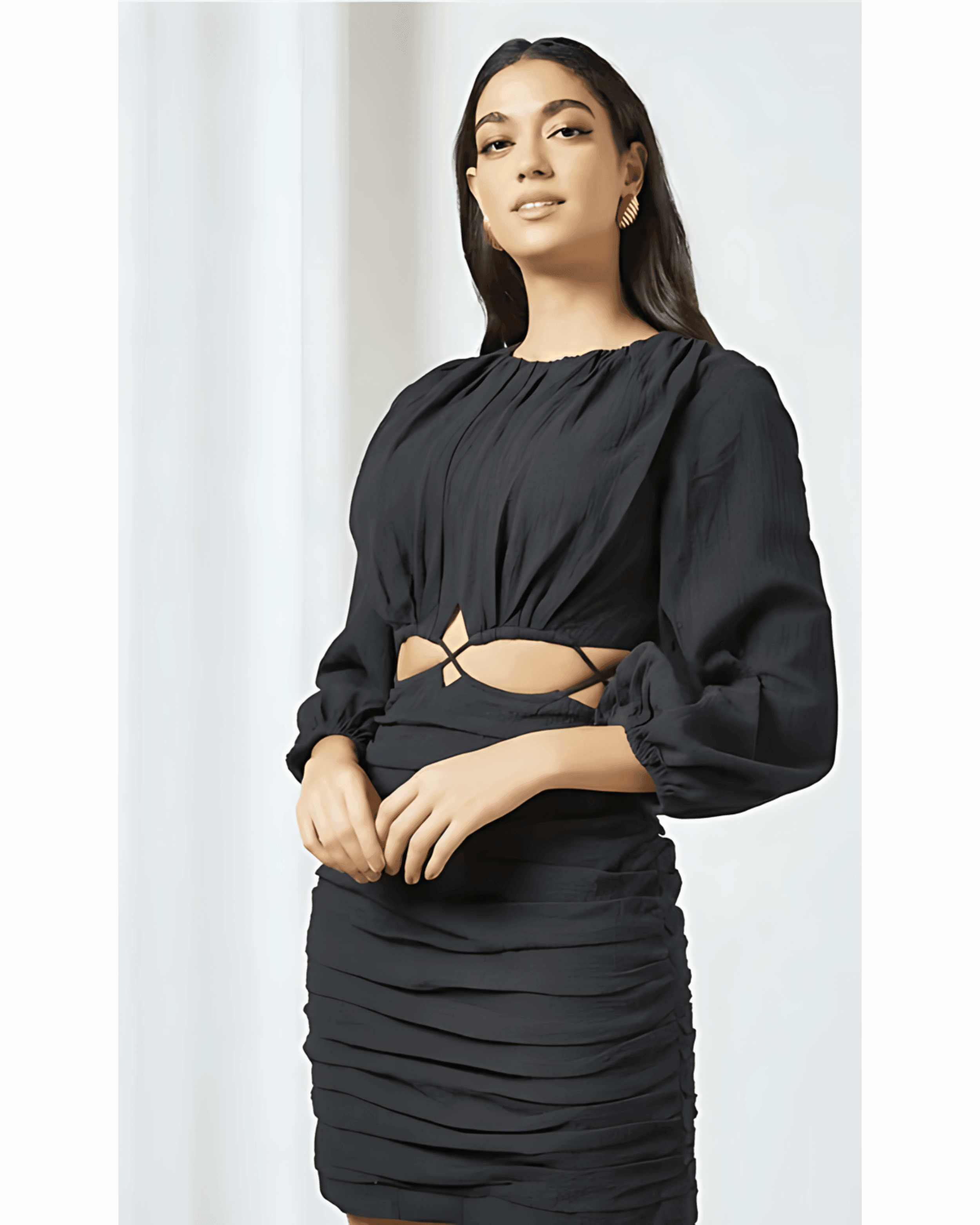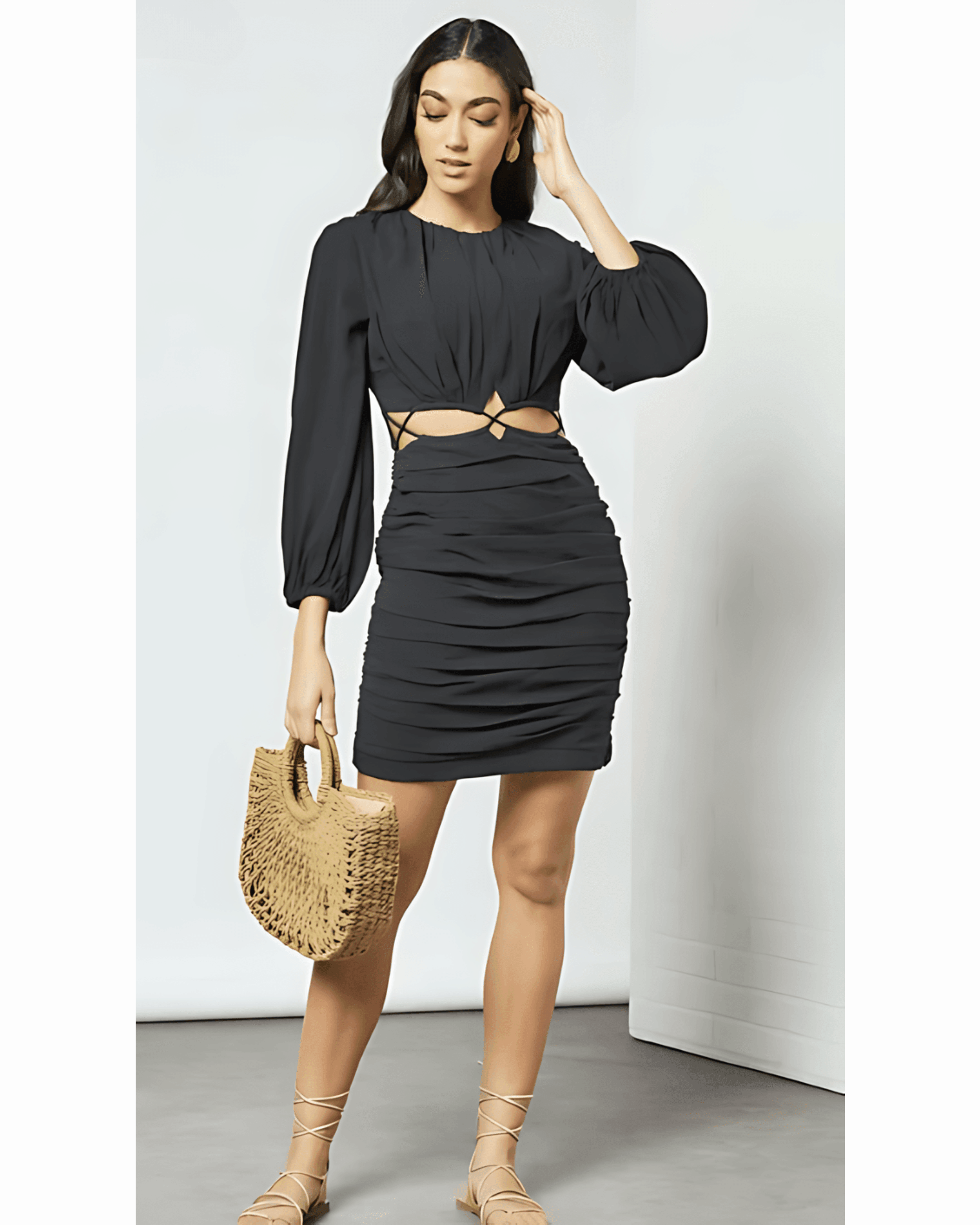 Black cut out dress with rouche detail on skirt.