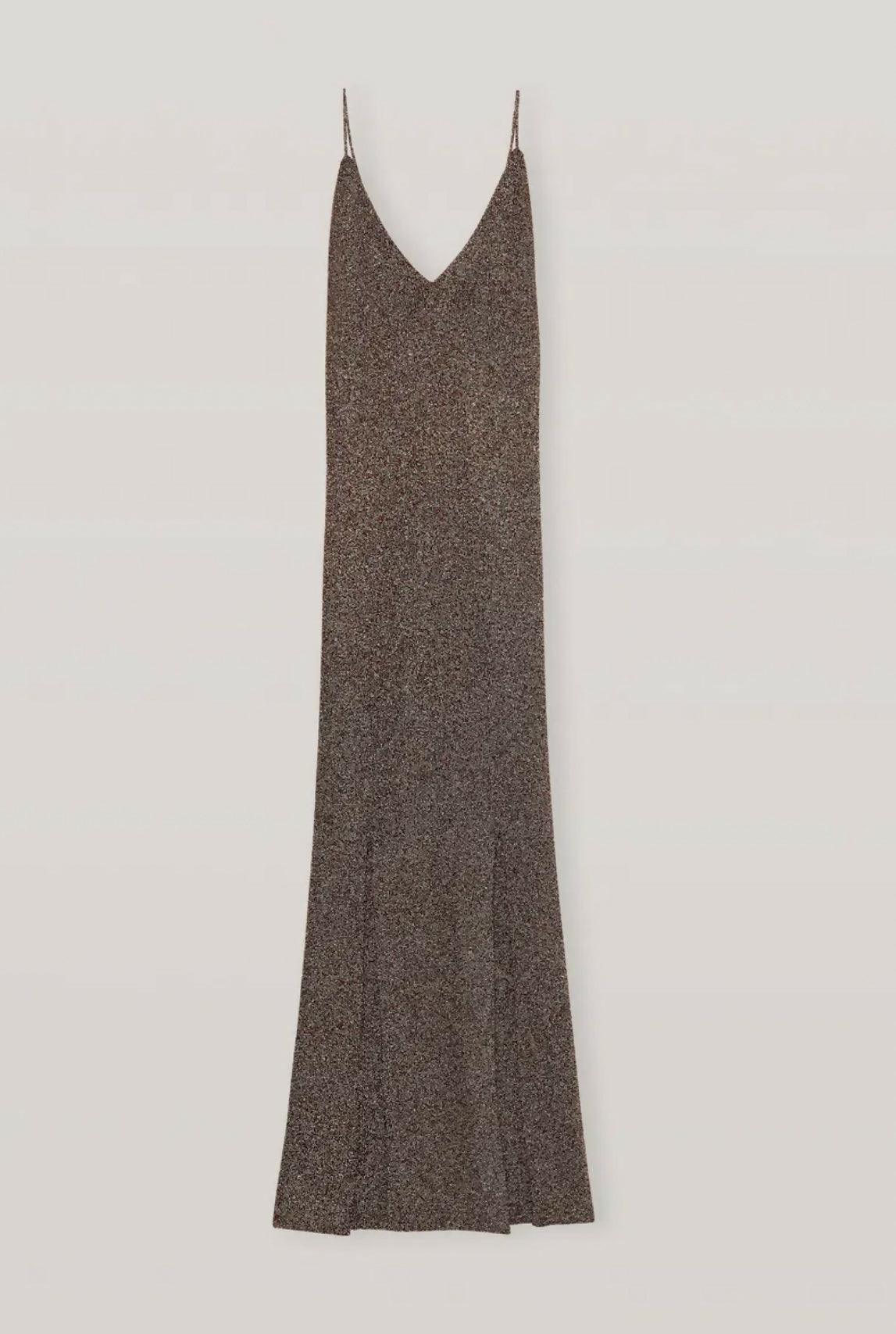 Glitter v-neck knitted maxi dress in a lurex-viscose blend, featuring an open back, spaghetti straps, and two side slits.