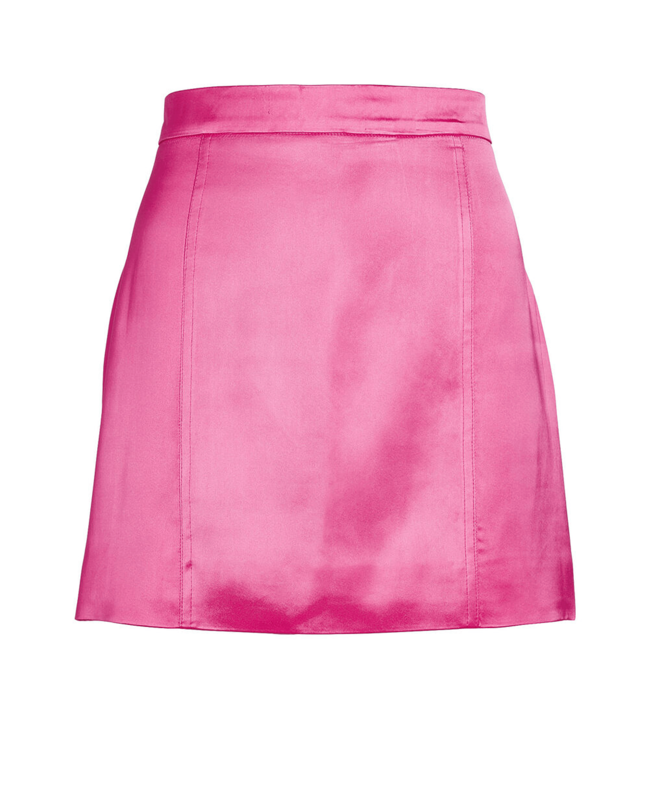 The label's Tuscany mini skirt is made from sleek Italian satin in a vibrant pink hue. Designed for a high-waist slim fit. Back zip closure.