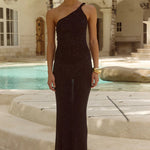 Our Diana Maxi Dress is the perfect holiday look, crafted from sheer knit with micro glitter, an open back and asymmetrical neckline, it’s sultry and alluring.