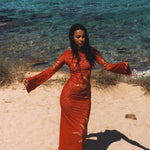 Featuring a a bold open back with tie fastening and luxury gold charm details, flared sleeve and in our signature mermaid maxi shape all perfectly completed with our Celeste print on the color of the season.