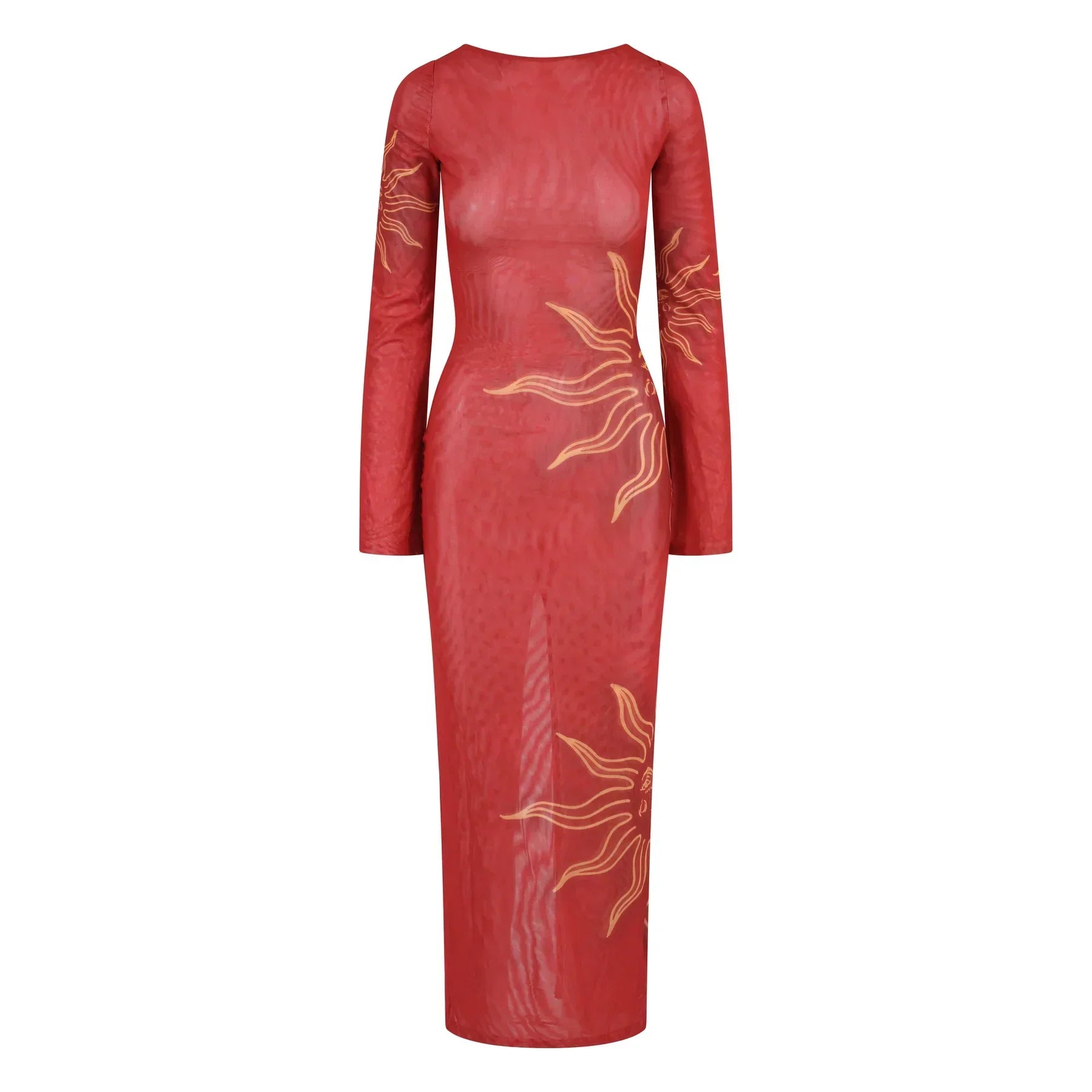 Celeste Cherry Red Double Layered Sculpting Mesh Maxi Dress