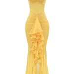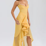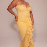The striking ruffle front of 'Gabbi' may be the first thing you notice but it's only one of many beautiful details. Glamorous with a vintage style, 'Gabbi' has the most beautiful silhouette that's perfectly gathered at the hip. This gorgeous apricot gown falls to a flirtatious waterfall ruffled front for plenty of drama.