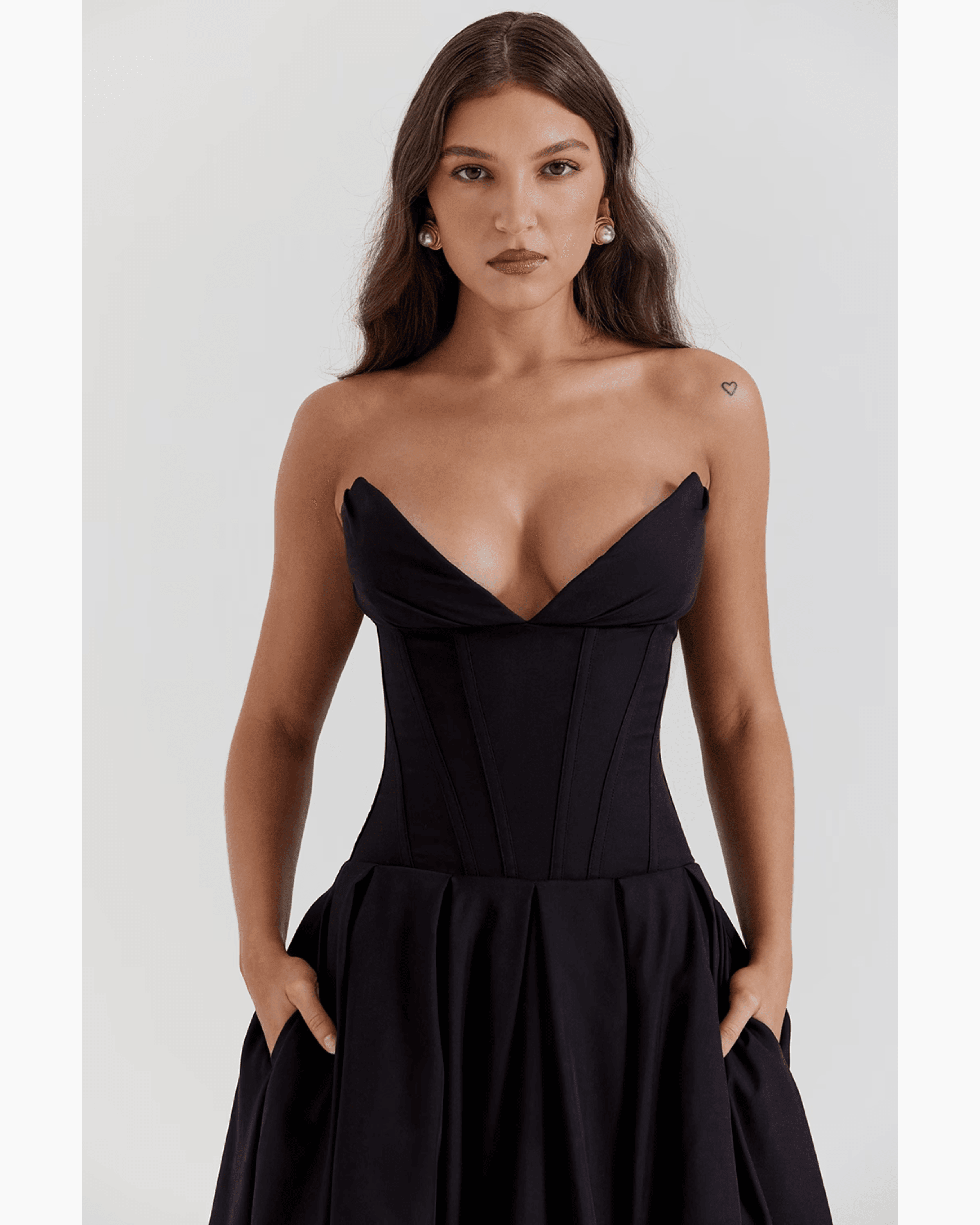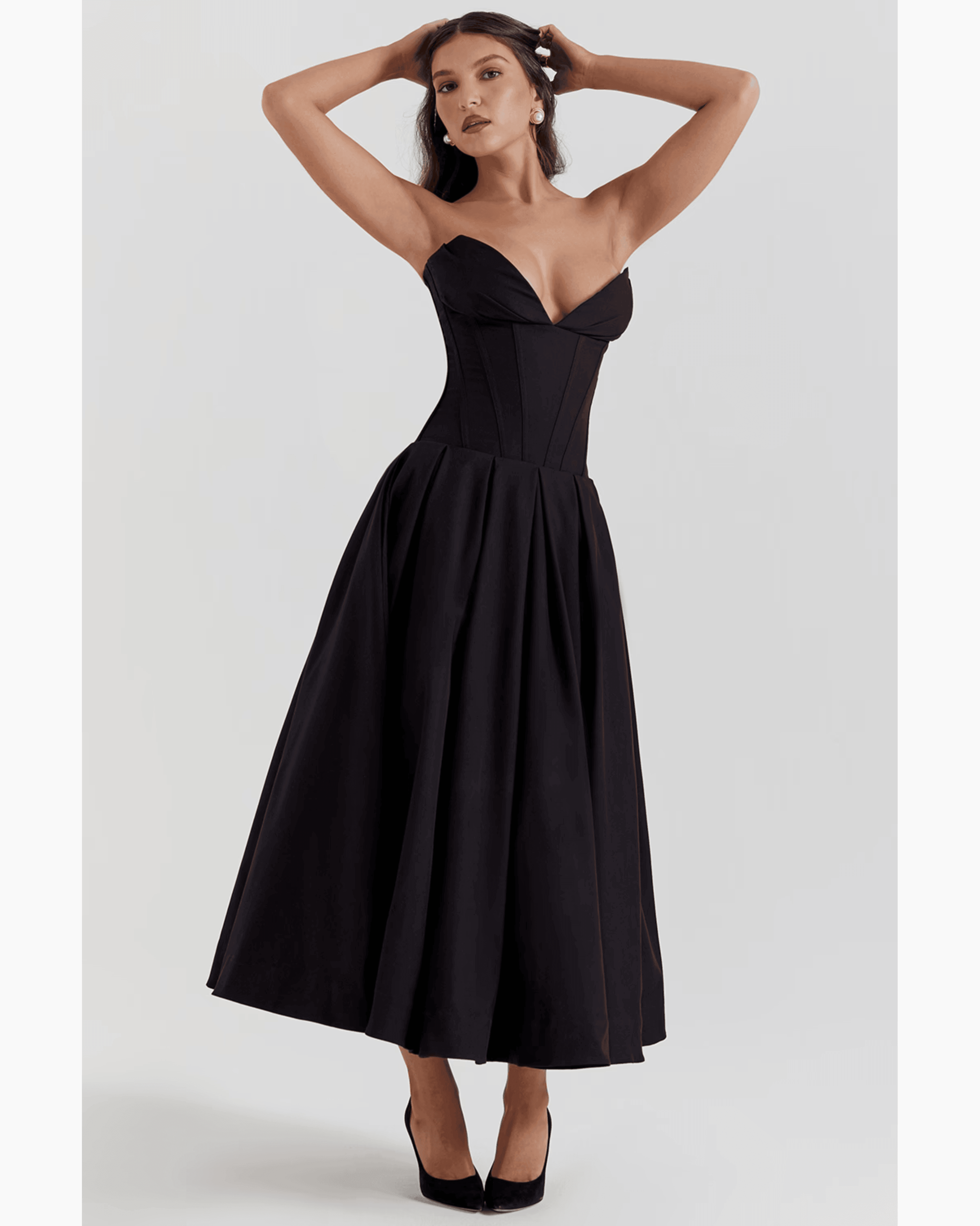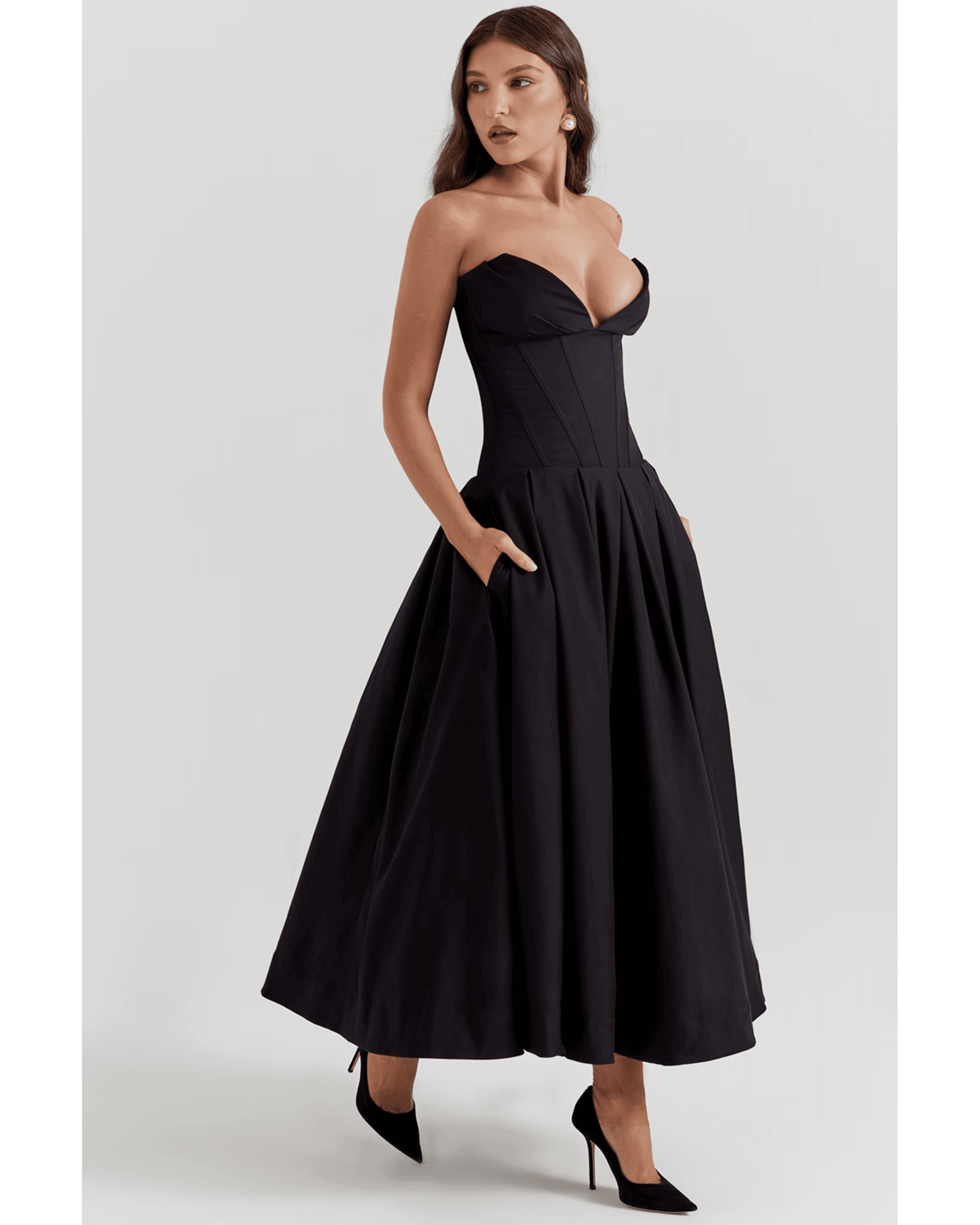 âLady' is simply THE dress for your special occasions this season. Feminine, chic, truly an icon. The architectural sculpted bodice is perfectly boned to cinch your waist and contrasted by the full, feminine, voluminous skirt. There's layers and layers of tulle under the skirt to maintain that perfect shape and it zips to the back for easy on.