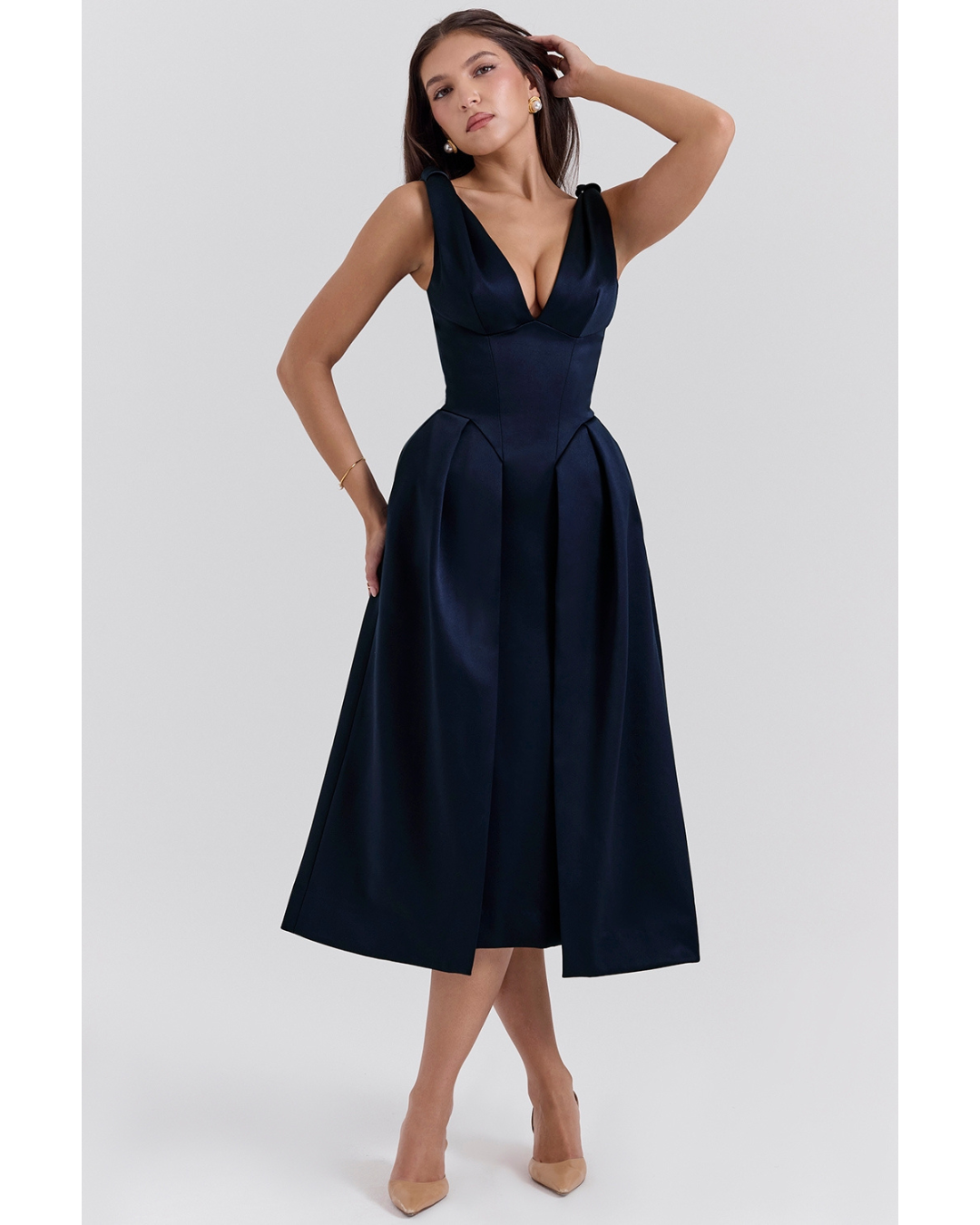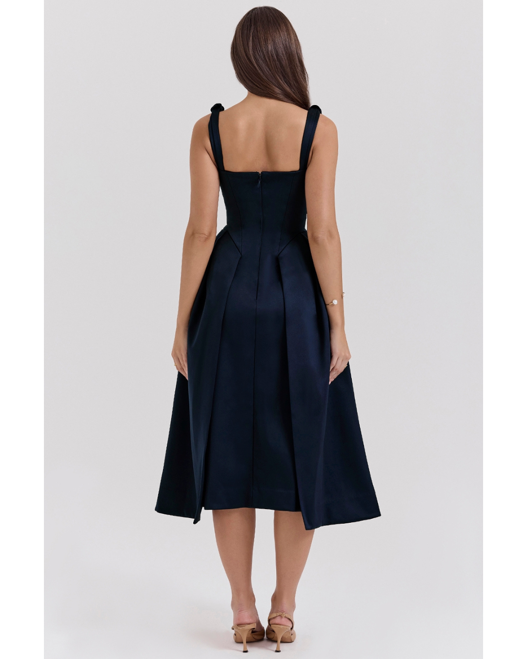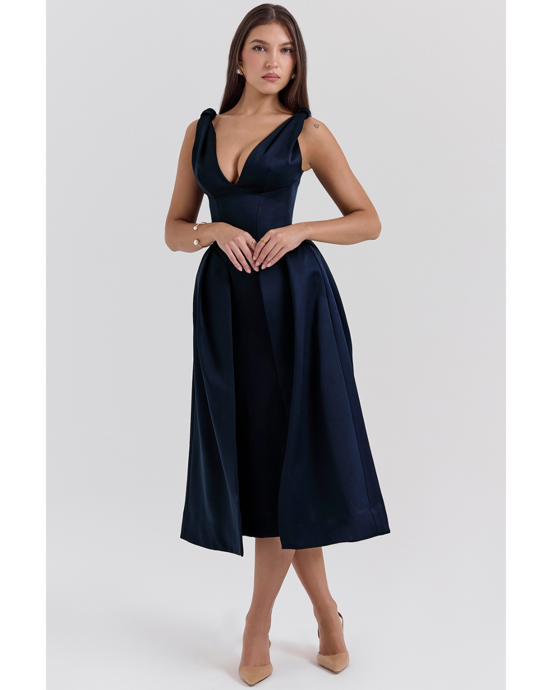 âPaloma' is a masterclass in midnight glamour. The plunging V-neckline offers a hint of allure, while the sweep of the twisted shoulder straps elongates the silhouette for a graceful finish. Now, let's talk about the bodice. Crafted from lustrous satin, it descends into a V-shape, mimicking the neckline and accentuating your waistline with an almost illusionary effect. The midi-length skirt is lined with soft tulle for a romantic touch, and it zips effortlessly at the back for easy wear. If you want to make a showstopping entrance at your next RSVP outing, âPaloma' should definitely be your plus one.