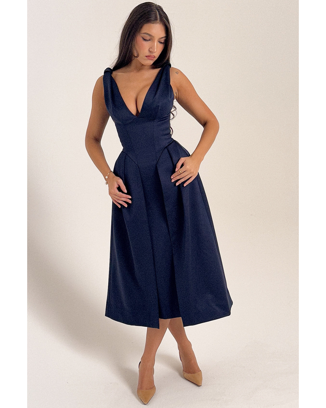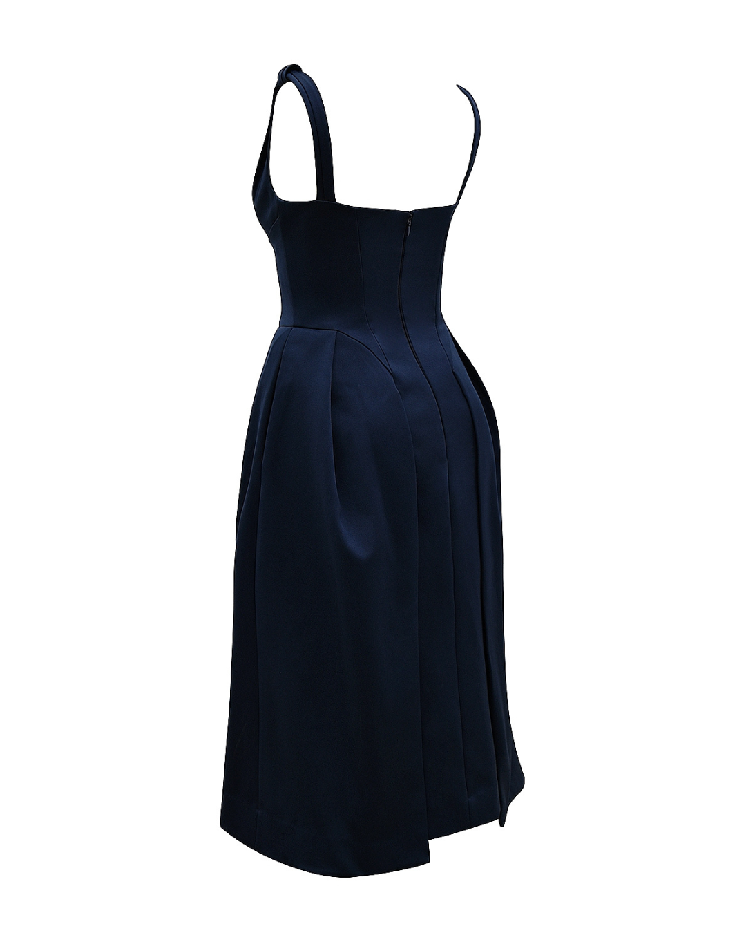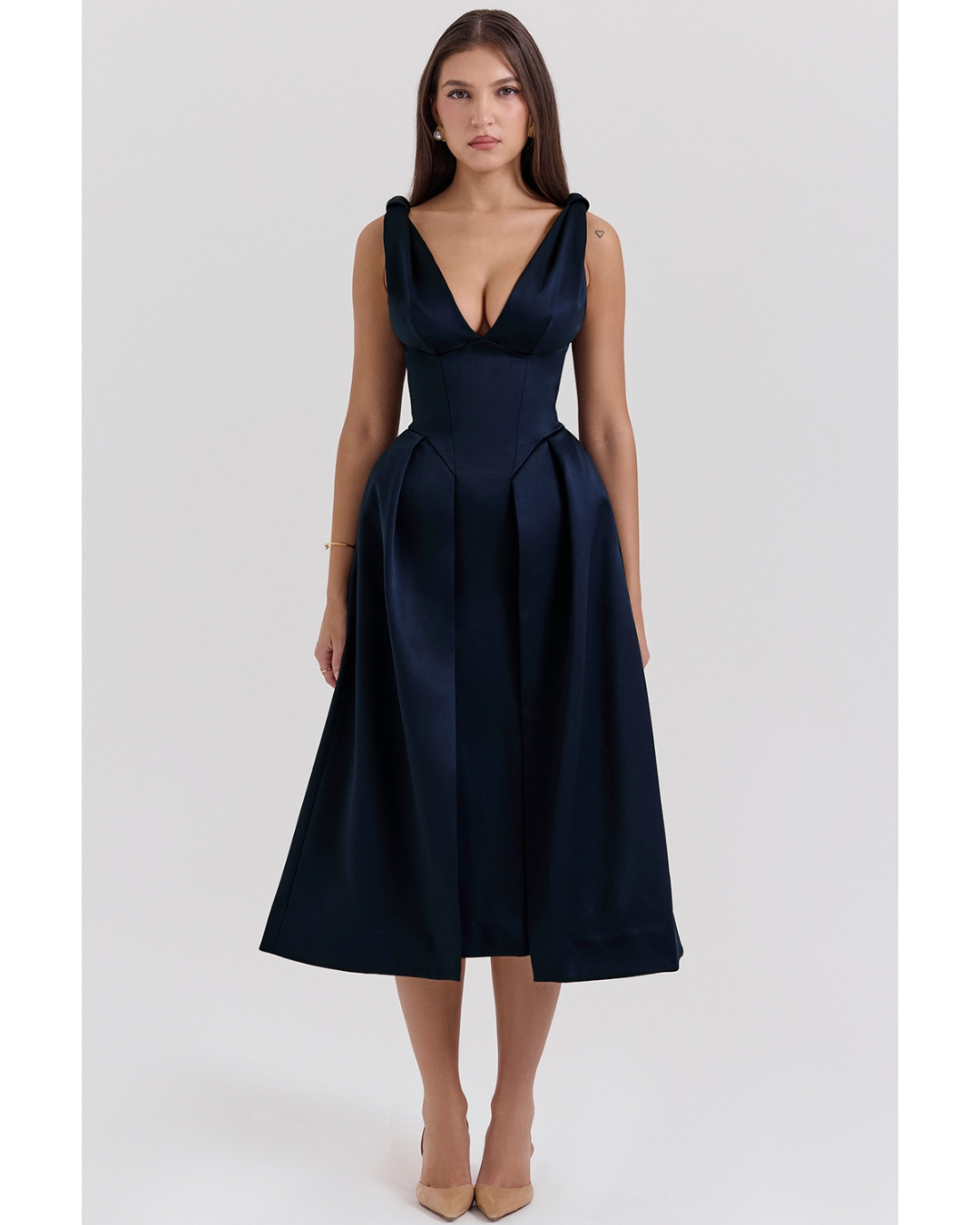 âPaloma' is a masterclass in midnight glamour. The plunging V-neckline offers a hint of allure, while the sweep of the twisted shoulder straps elongates the silhouette for a graceful finish. Now, let's talk about the bodice. Crafted from lustrous satin, it descends into a V-shape, mimicking the neckline and accentuating your waistline with an almost illusionary effect. The midi-length skirt is lined with soft tulle for a romantic touch, and it zips effortlessly at the back for easy wear. If you want to make a showstopping entrance at your next RSVP outing, âPaloma' should definitely be your plus one.