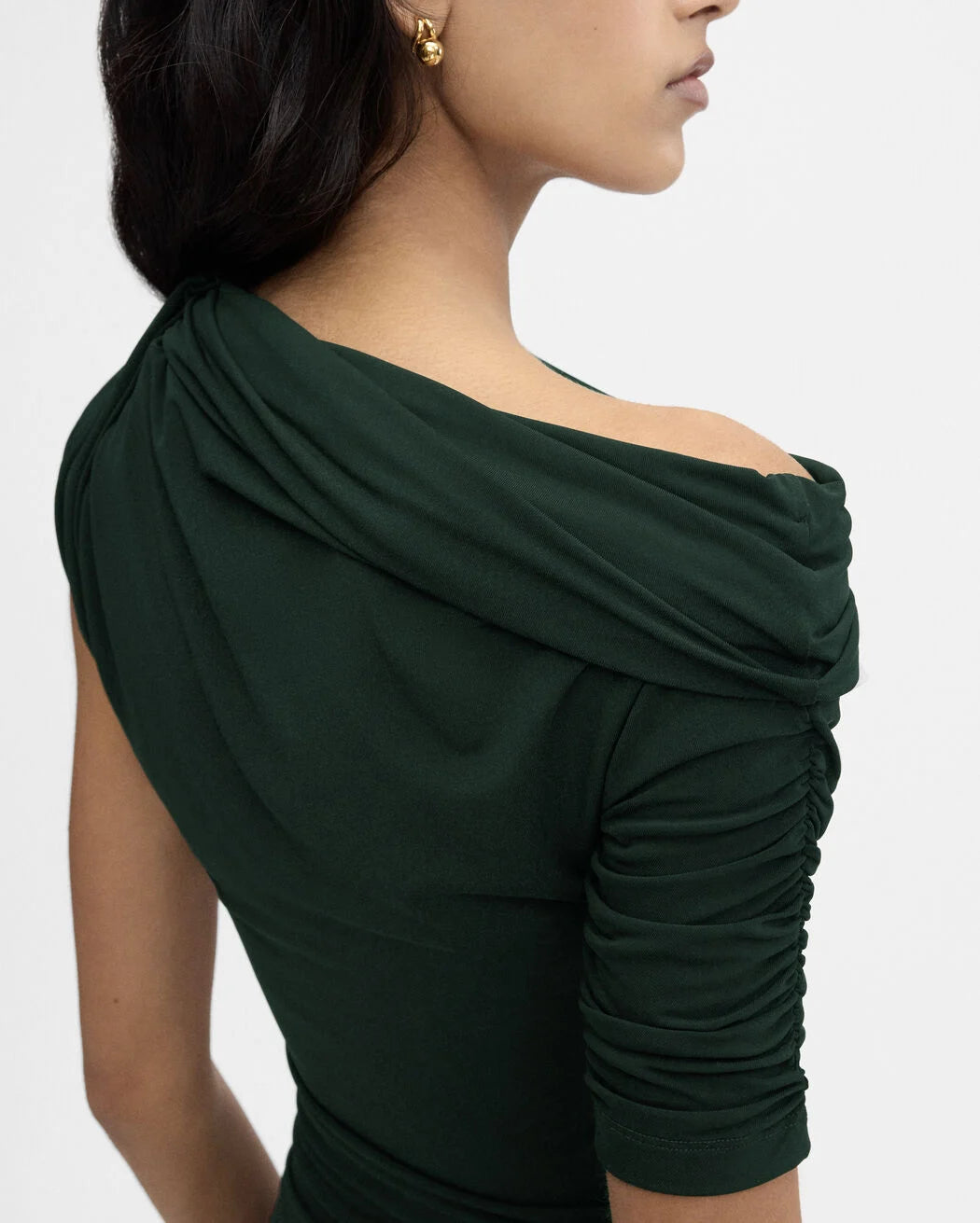 - Draped asymmetric neckline