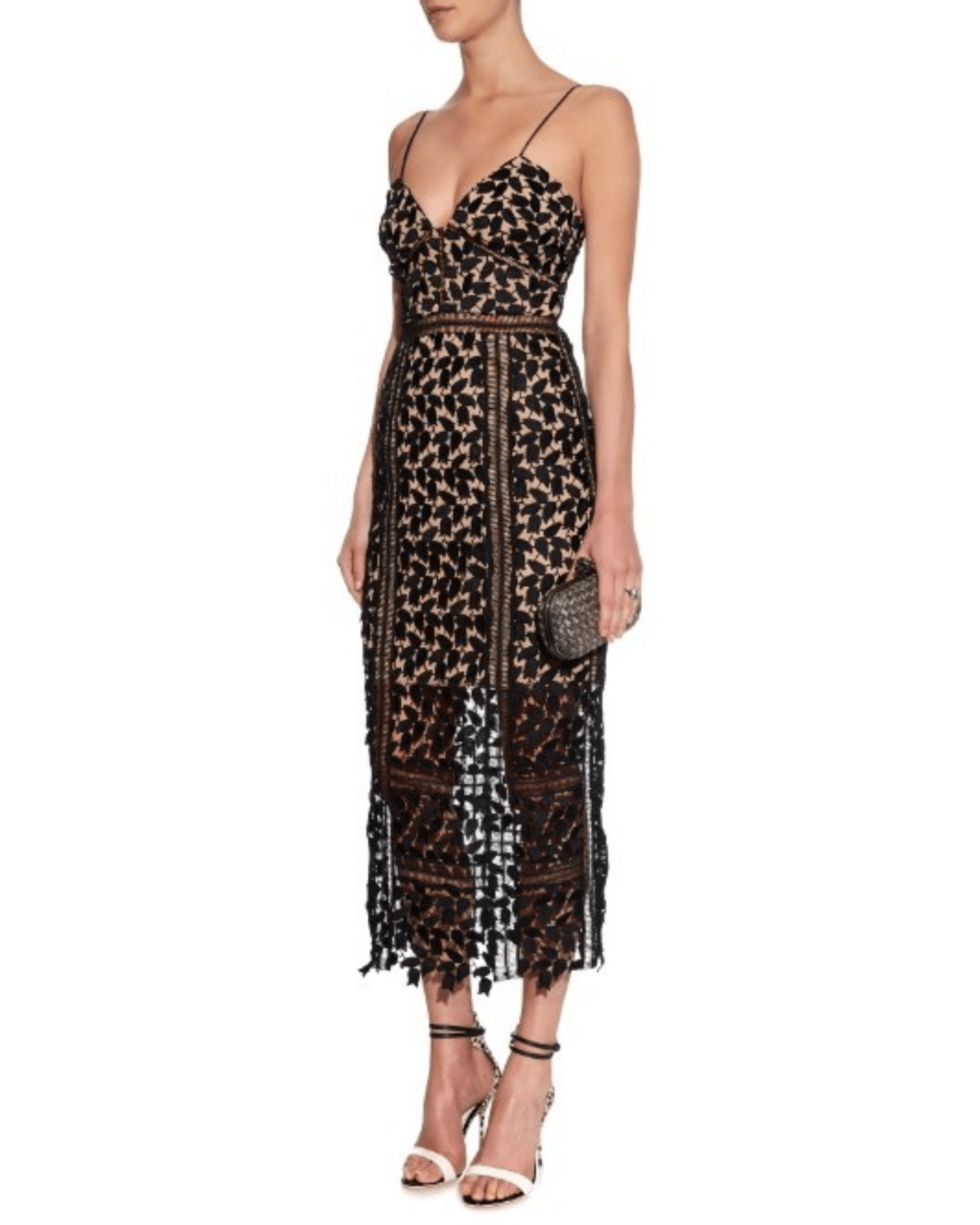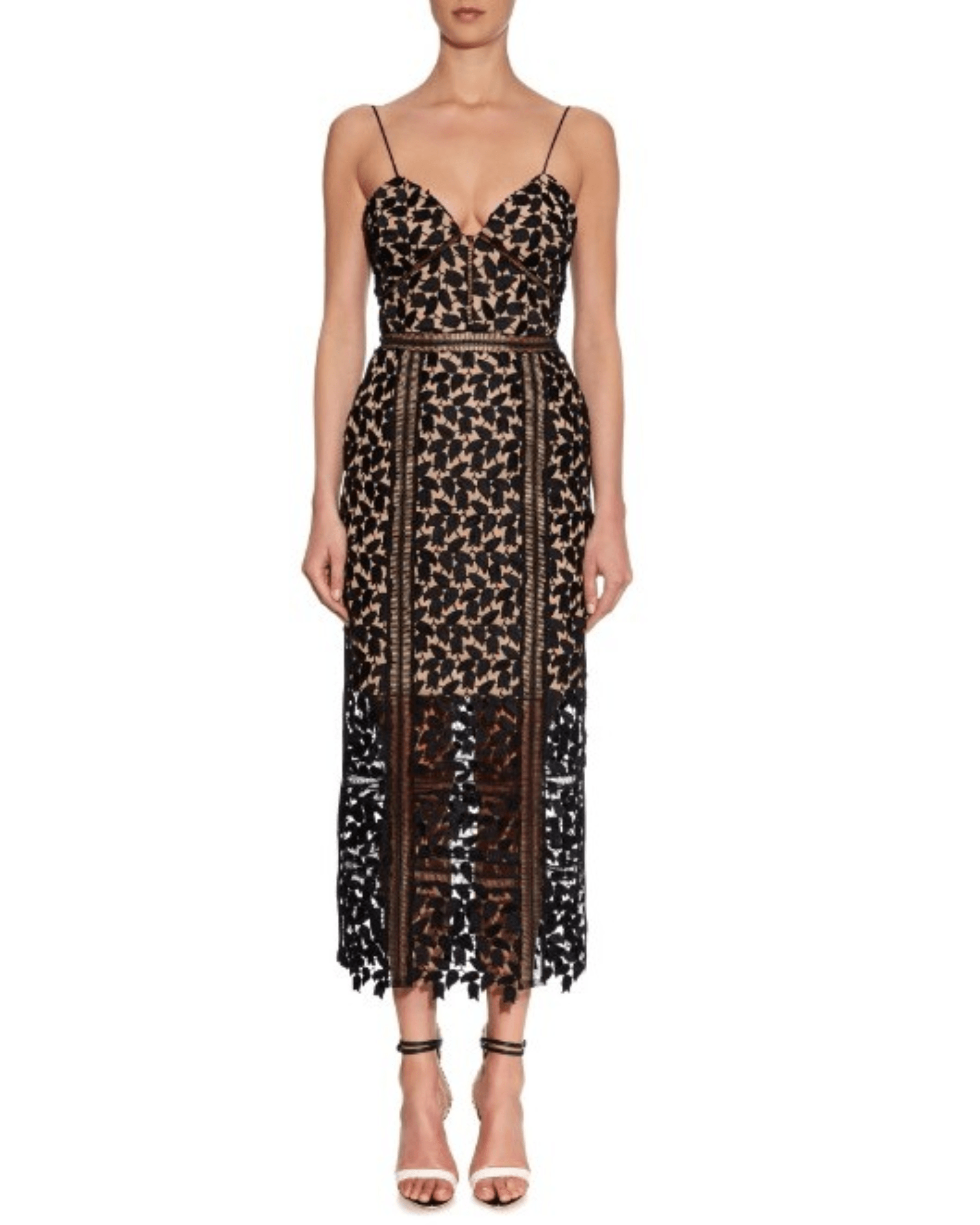 The iconic Self Portrait Arabella Dress. Midi-length lace dress with skin-toned underlining that gives an illusion effect. Also works well with darker skin tones.