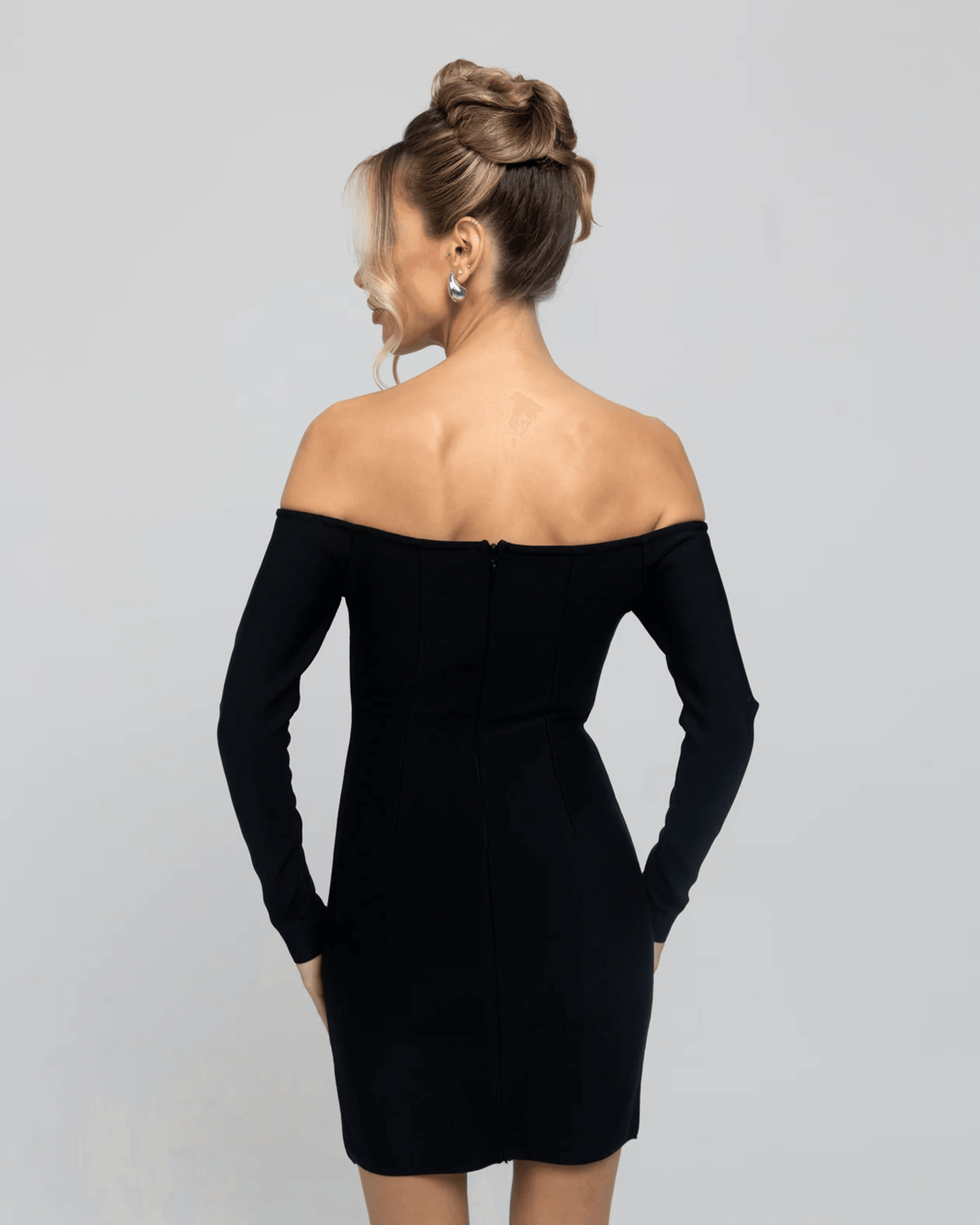 Make a bold statement with the DIAMOND CUT Mini Dress, where elegance meets undeniable edge. This off-the-shoulder dress is crafted in a sleek black fabric that hugs your figure flawlessly, while the dazzling crystal-embellished bodice adds a hint of glamour and drama. Perfect for those nights when you want to be remembered, DIAMOND CUT is designed to turn heads and steal the spotlight. Pair it with minimal accessories, and let this dress do all the talking. Step out and shine in a piece that's anything but ordinary.