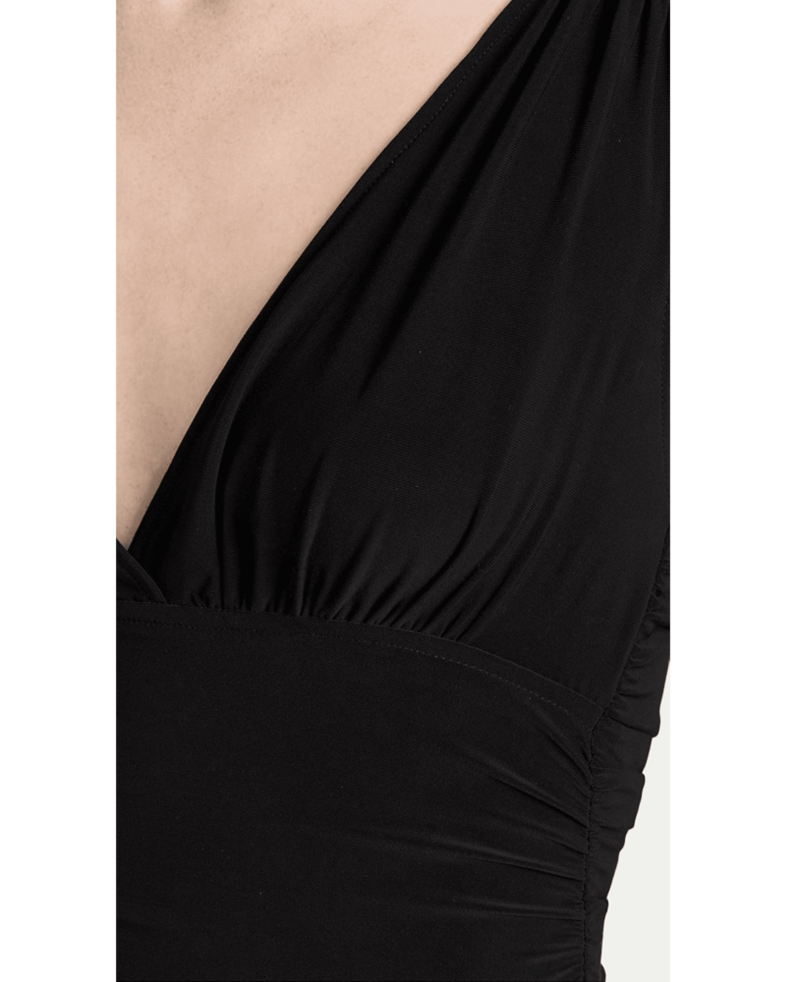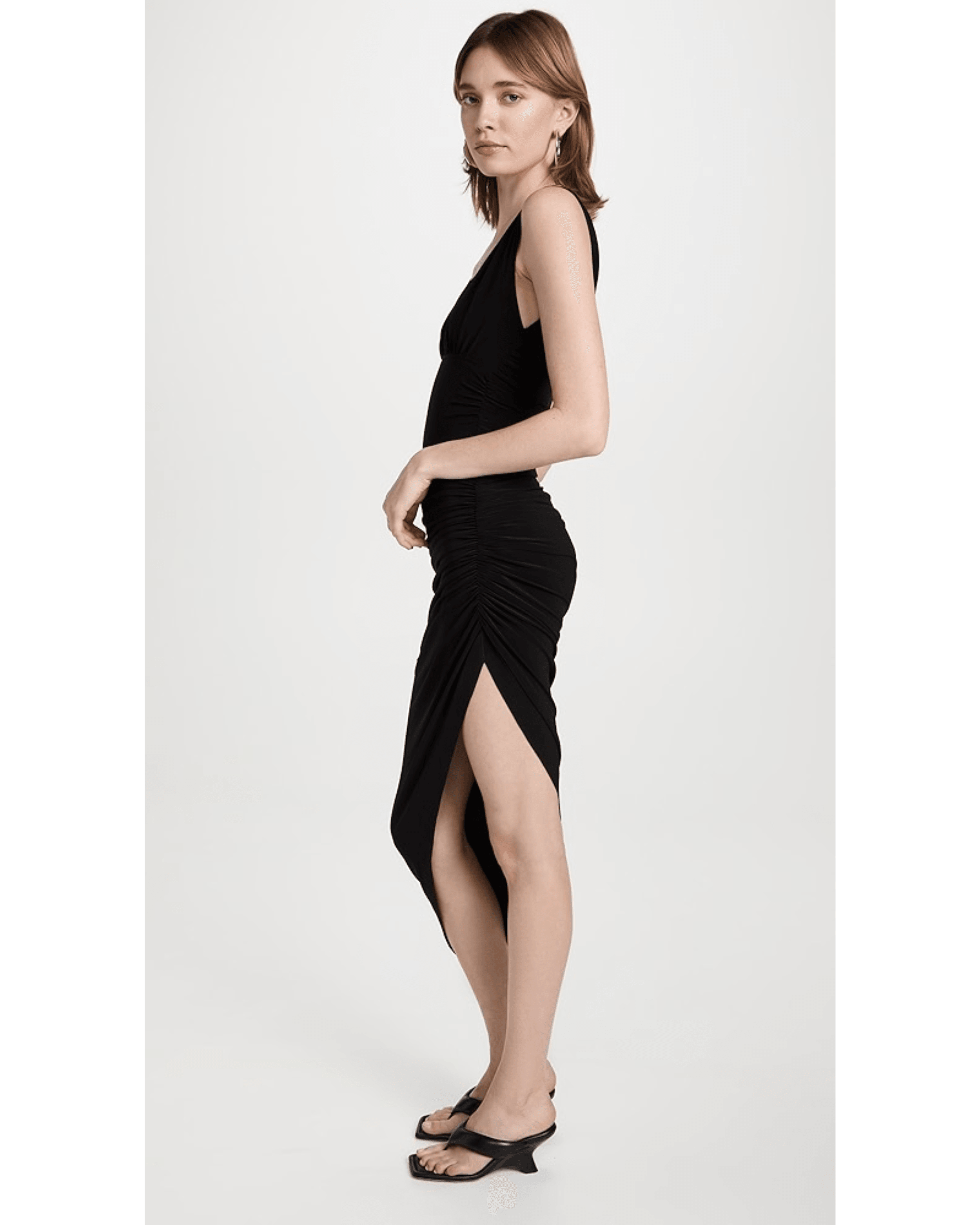 Crafted from lightweight black jersey, this ruched Norma Kamali gown is designed to gently hug your figure through the hips, before finishing with a dramatic angular hem.
